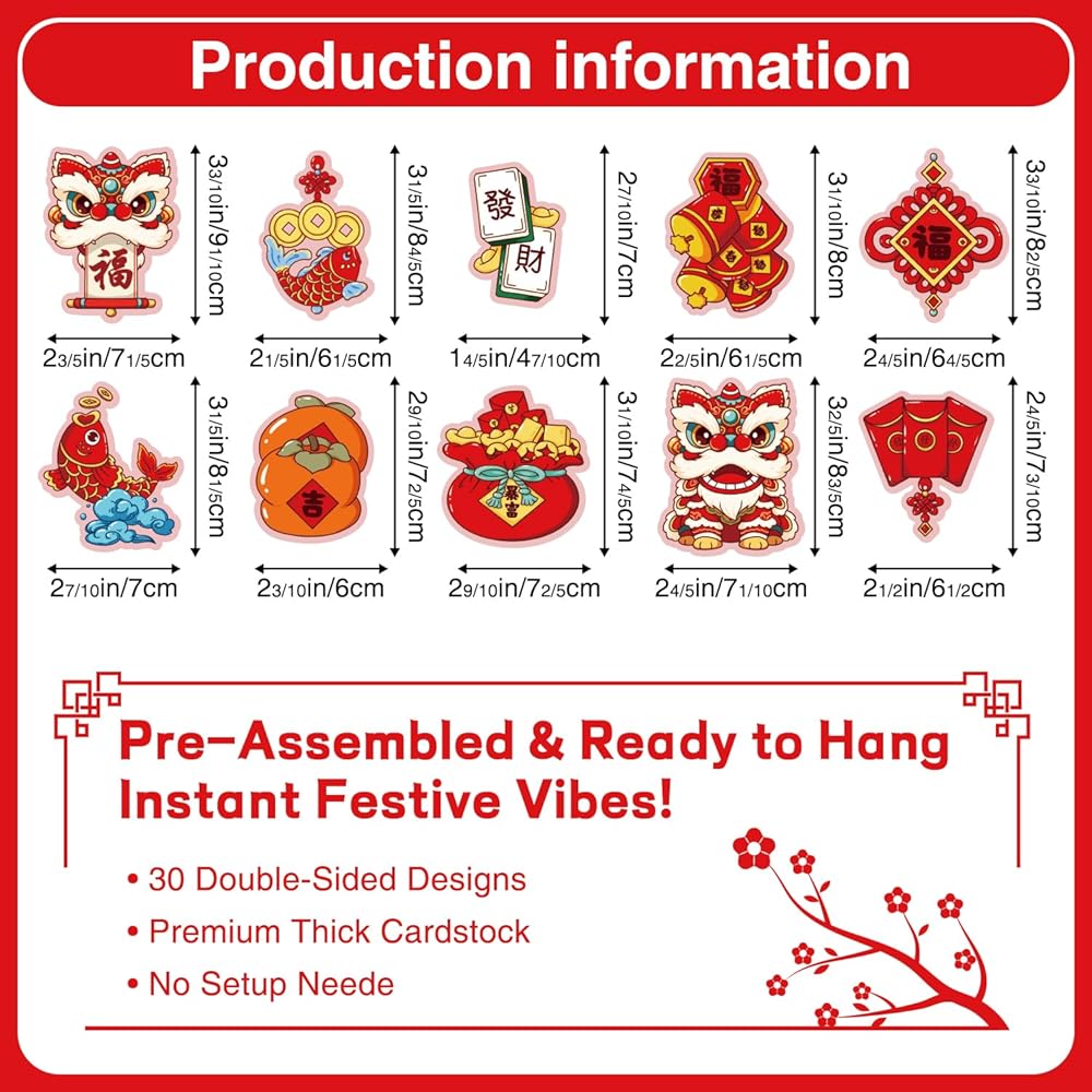 Made from sturdy yet lightweight premium cardboard with double-sided printing, each ornament looks vivid from every direction while resisting bending, creasing, and warping during extended display. They hold their shape, maintain bright color, and can be saved and reused for future Lunar New Year celebrations.