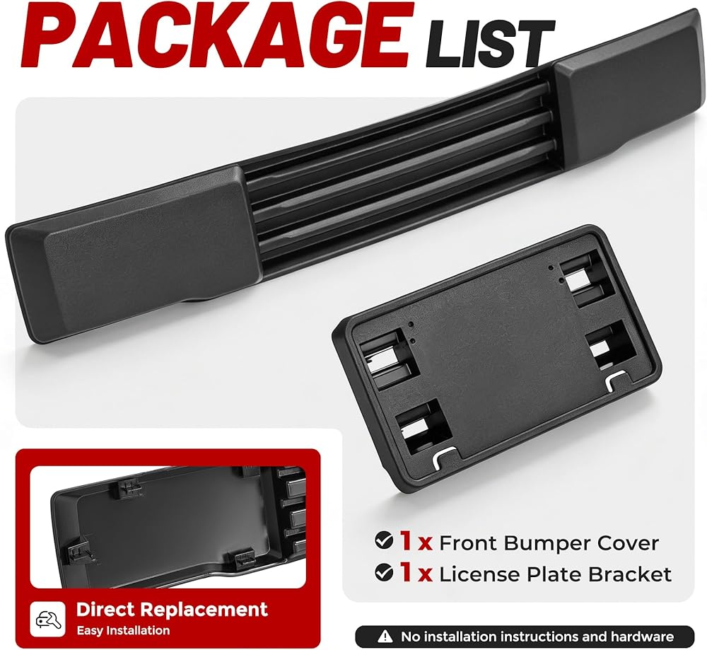 Package List: 1 Front Bumper Cover, 1 License Plate Bracket included. Instruction and mounting hardware are not included