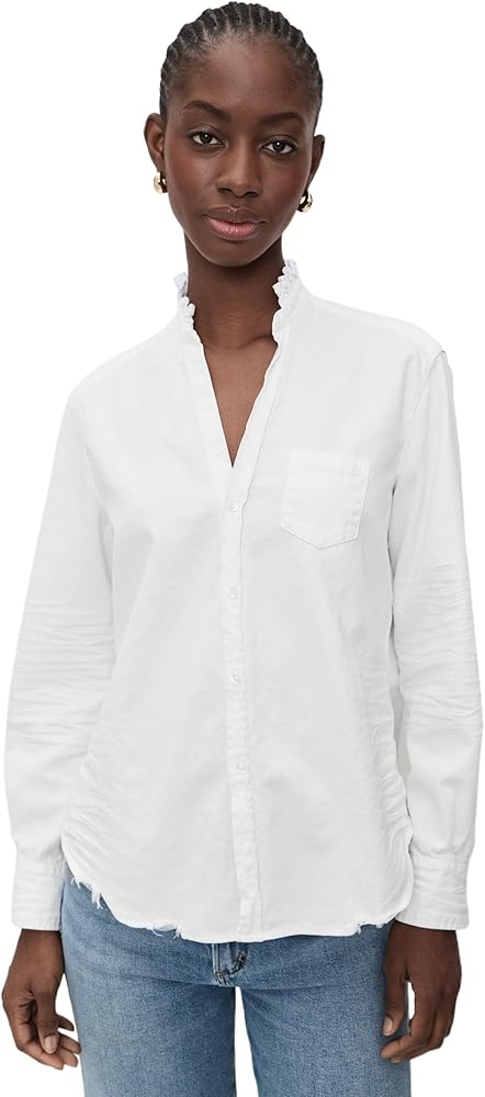 - Distressed details, Ruffle trim at neckline