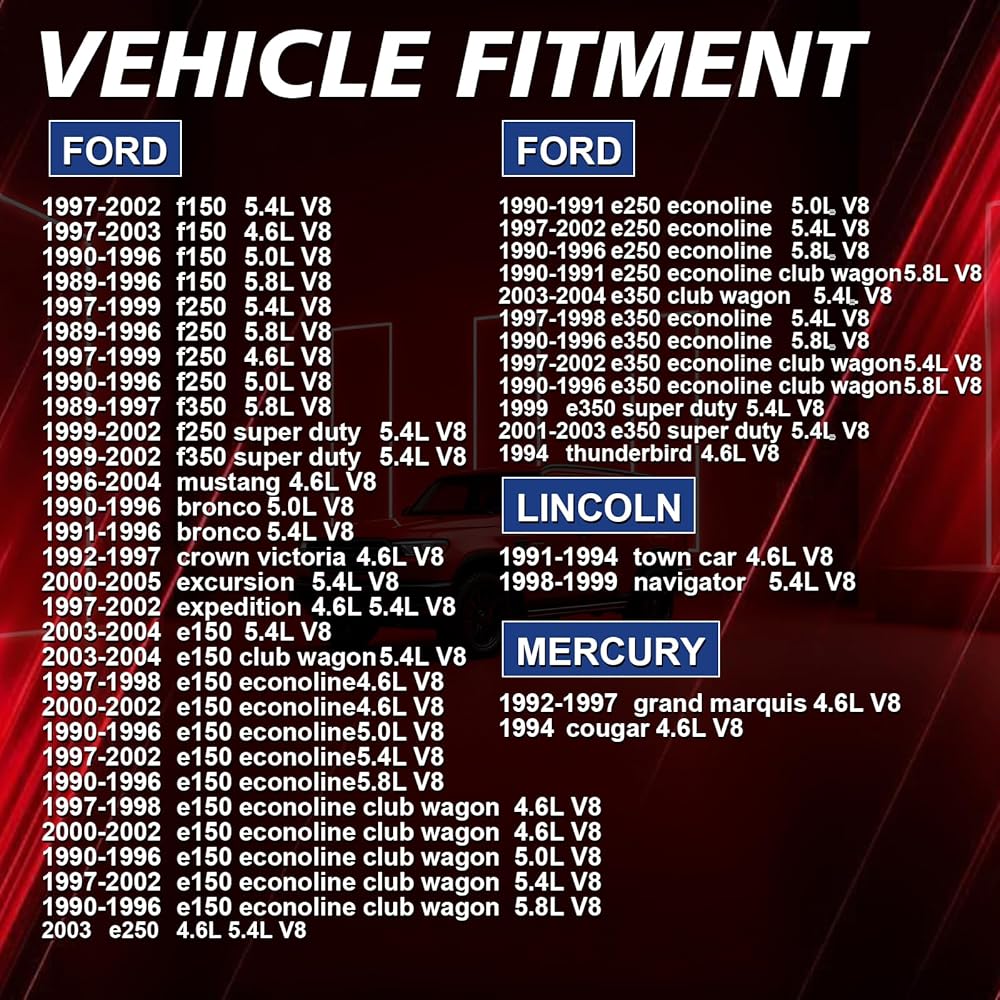 Compatible With/4: [V8]2003 2004 Ford E150/E150 Club Wagon 5.4L, 1997 1998 2000-2002 Ford E150 Econoline 4.6L, 1990-1996 Ford E150 Econoline 5.0L 5.8L, 1997-2002 Ford E150 Econoline 5.4L, 1997 1998 2000-2002 Ford E150 Econoline Club Wagon 4.6L, 1990-1996 Ford E150 Econoline Club Wagon 5.0L 5.8L, 1997-2002 Ford E150 Econoline Club Wagon 5.4L/ 2003 Ford E250 4.6L 5.4L, 1990 1991 Ford E250 Econoline 5.0L, 1997-2002 Ford E250 Econoline 5.4L, 1990-1996 Ford E250 Econoline 5.8L, 1990 1991 Ford E250 Econoline Club Wagon 5.0L