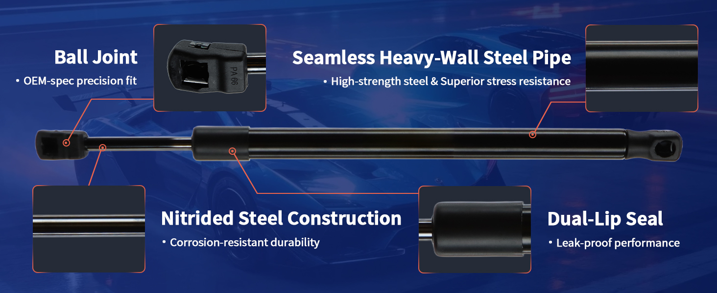 【Premium Corrosion-Resistant Build】 Cold-forged steel construction with electrophoresis coating ensures maximum durability for automotive lift supports. Features nitrile rubber-sealed gas springs resistant to wear, heat (up to 248°F/120°C), and corrosion – outperforming standard hood support struts in harsh weather conditions.