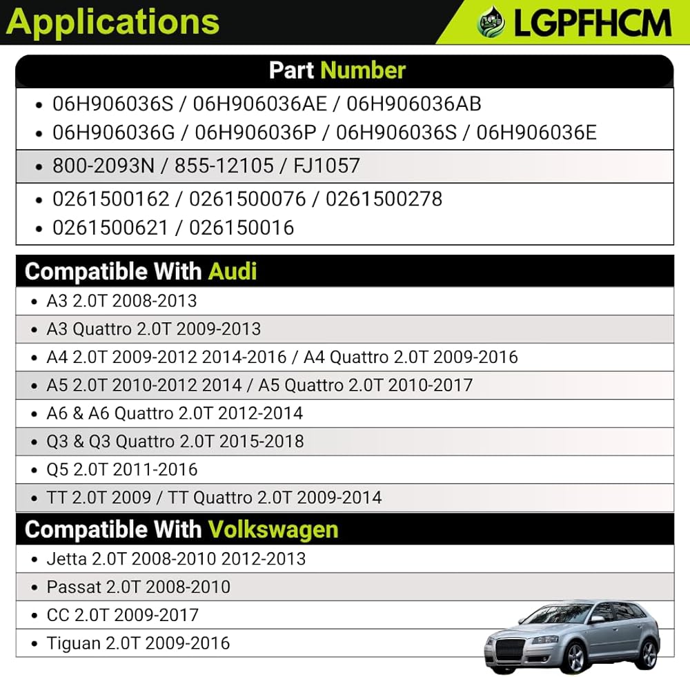 Part Numbers: FJ1057 / 06H906036S / 06H906036AE / 06H906036AB / 06H906036G / 06H906036P / 06H906036S / 06H906036E / 800-2093N / 855-12105 / 0261500162 / 0261500076 / 0261500278 / 0261500621 / 026150016 Compatible with Audi A3 2.0T 2008-2013; A3 Quattro 2.0T 2009-2013 / A4 2.0T 2009-2012 2014-2016; A4 Quattro 2.0T 2009-2016 / A5 2.0T 2010-2012 2014 / A5 Quattro 2.0T 2010-2017 / A6 & A6 Quattro 2.0T 2012-2014 Compatible with Audi: Q3 & Q3 Quattro 2.0T 2015-2018 / Q5 2.0T 2011-2016 / TT 2.0T 2009 / TT Quattro 2.0T 2009-2014 Compatible with Volkswagen Beetle 2.0T L4 2012-2013 / CC 2.0T 2012-2016, Eos 2.0T 2009-2016 / GTI 2.0T 2009-2013 Compatible with Volkswagen Jetta 2.0T 2008-2010 2012-2013 / Passat 2.0T 2008-2010 / CC 2.0T 2009-2017 / Tiguan 2.0T 2009-2016