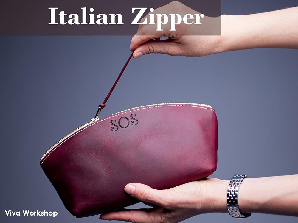 Makeup bag waterproof lining keeps safe your belongings from spilling. Be sure that makeup bag won't tear due to handcraft sewing that keeps stitching reliable. Bag Italian Zipper protects travel toiletries against fall out. This leather makeup bag is multifunctional as you get all in one: womens handbag, evening bag, elegant clutch for cosmetics, formal makeup bag for women, wedding purse, wristlet handbag for accessories, womens travel handbag, makeup bag, customized purse for women, party makeup purse, casual going out purse, womens cosmetic bag, personalized makeup bag gift