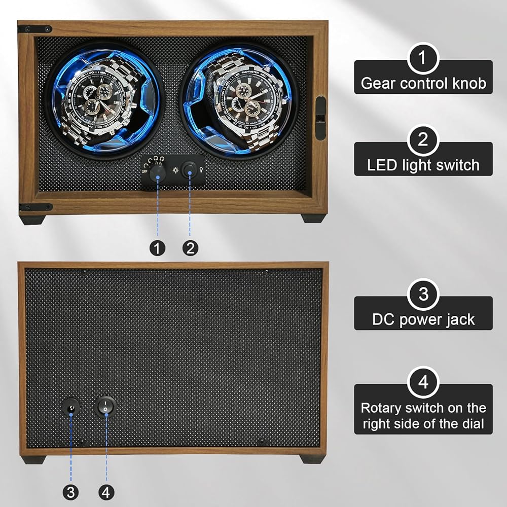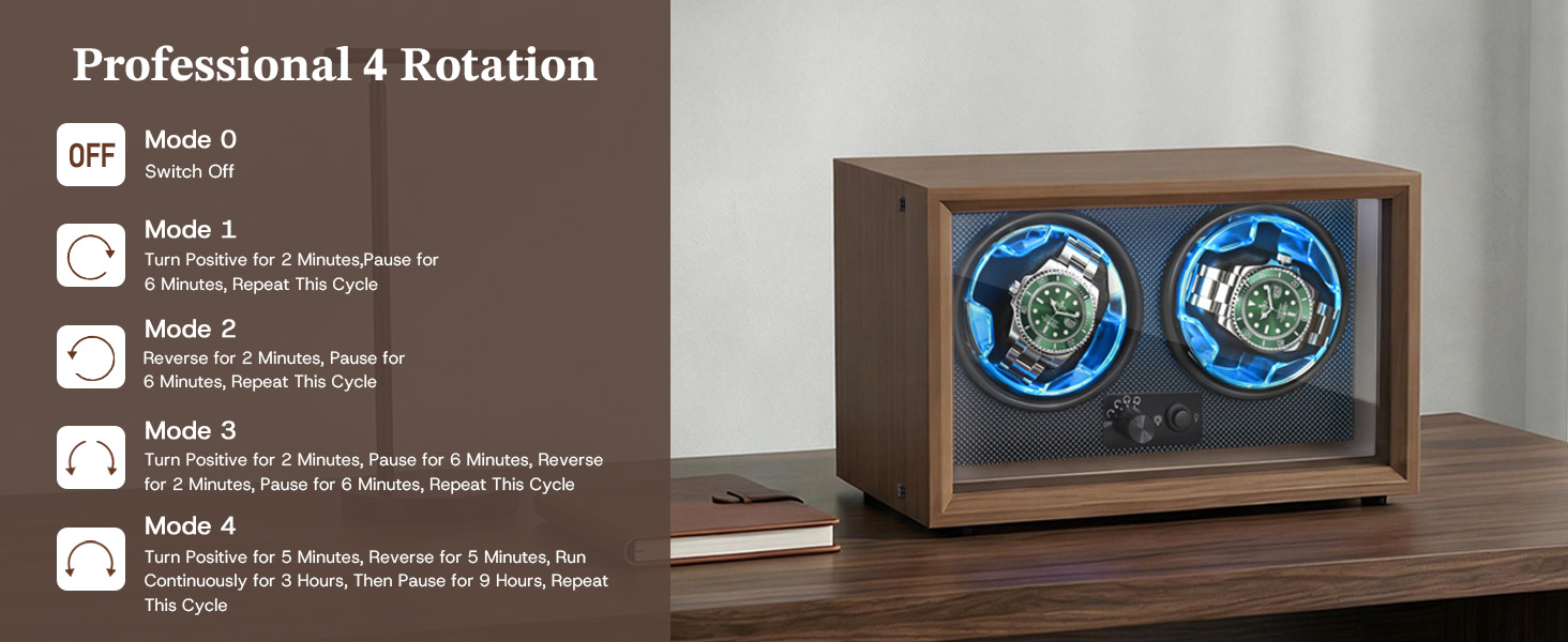 4 Rotation Modes Watch Winder Box:The watch winder for automatic watches features four rotation settings including clockwise, counterclockwise, and alternating directions. These modes allow the watch winding machine to support different automatic watch mechanisms while functioning as a reliable watch spinner and watch rotator.