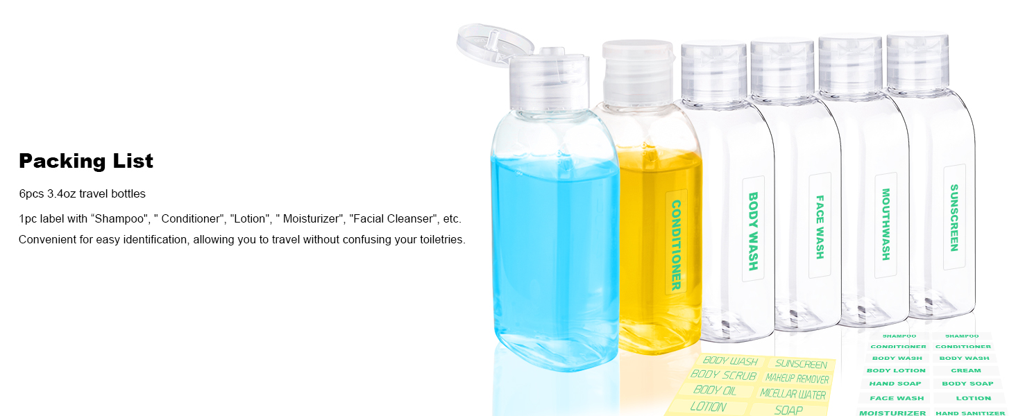 Travel Essentials: This travel containers for toiletries set includes 6 empty bottles with flap cap. The clear plastic travel bottles for toiletries allow you to easily see what's inside. This travel bottle features a lightweight and compact design, making it effortless to carry.