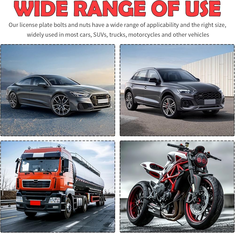 3. Thread specification is M5, suitable size, widely used in most cars, SUVs, trucks, motorcycles and other vehicles, play the role of license plate fixing and simple decoration, not easy to break and damage, keep long-term stable use