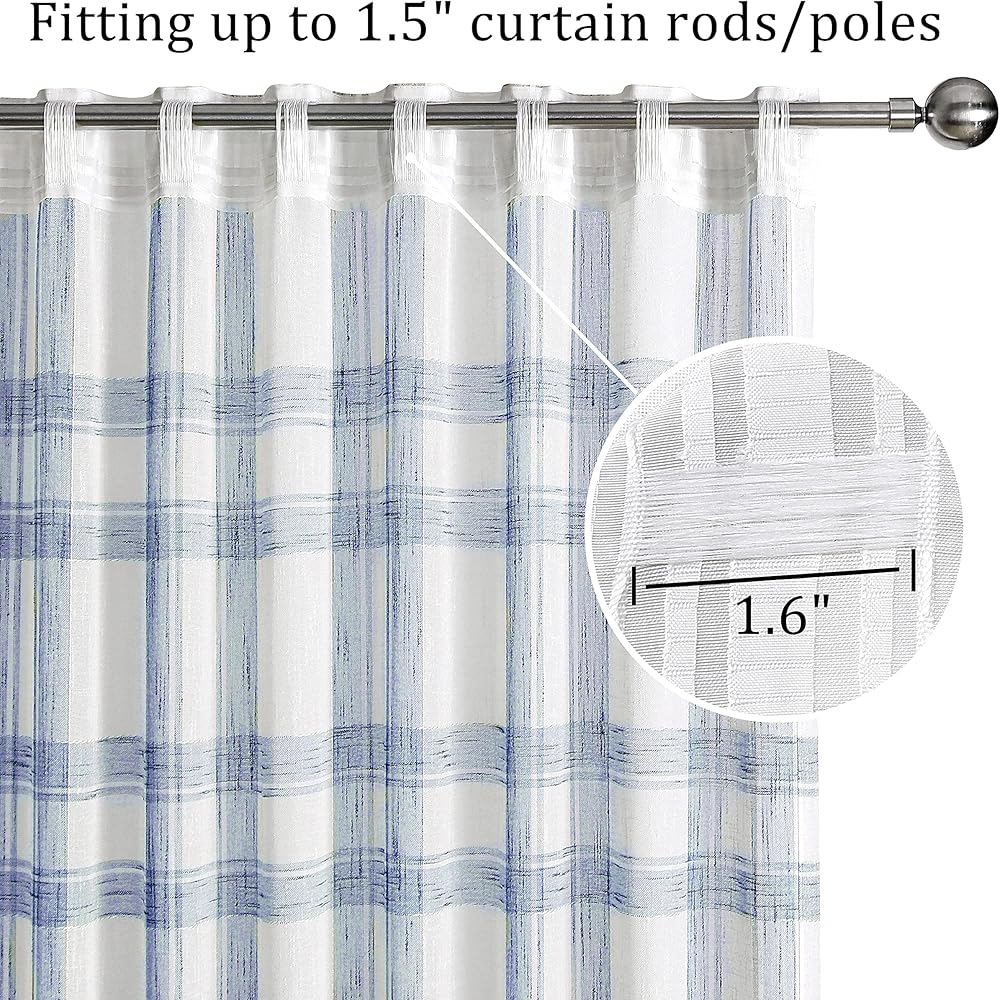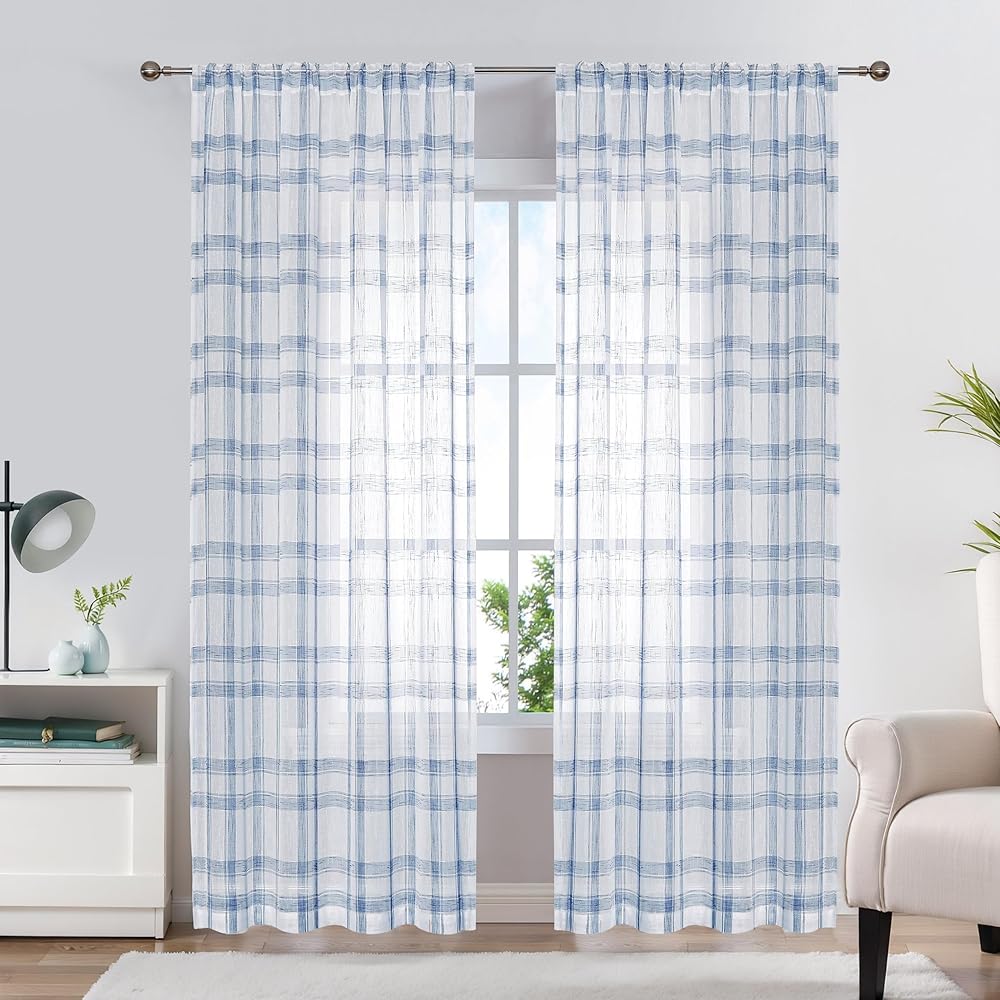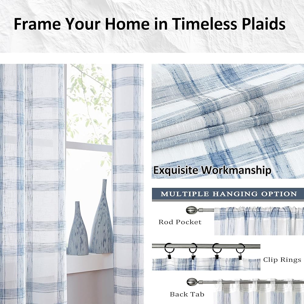 Randall Buffalo Plaid Semi Sheer Curtains for Living Room Linen-Look Geometric Light Filtering Dining Room Window Drape for Farmhouse Bedroom Study Room,Blue/White,54x84 inch Long,2 Panels