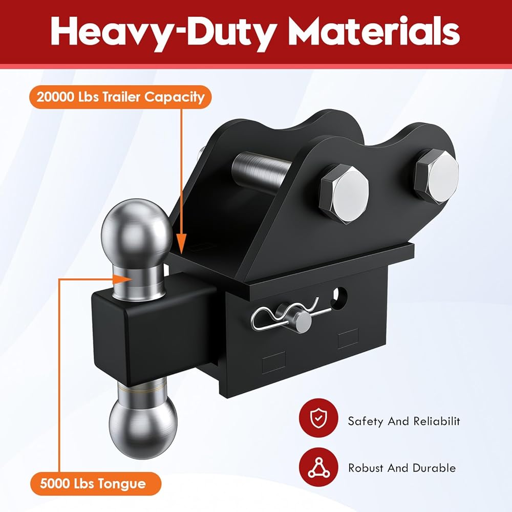 Heavy-Duty Alloy Steel, Strong Load Capacity: Constructed from heavy-duty alloy steel, it delivers a 5000 lbs tongue load and 20000 lbs gross trailer weight capacity. This mini excavator accessory handles most towing needs with ease, featuring sturdiness, durability, safety and reliability.