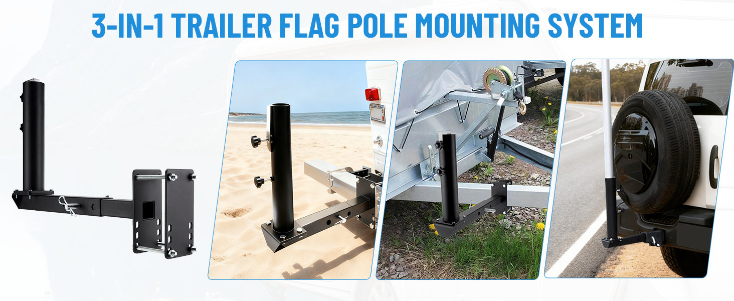 3 in 1 Frame/Hitch/Bumper Flag Pole Holder: Heavy duty flag pole mount offers 3 different installation methods,which can be flexibly installed on the rear bumper of the trailer, the front A-frame, and the hook at the rear of the car, meet all installation needs.