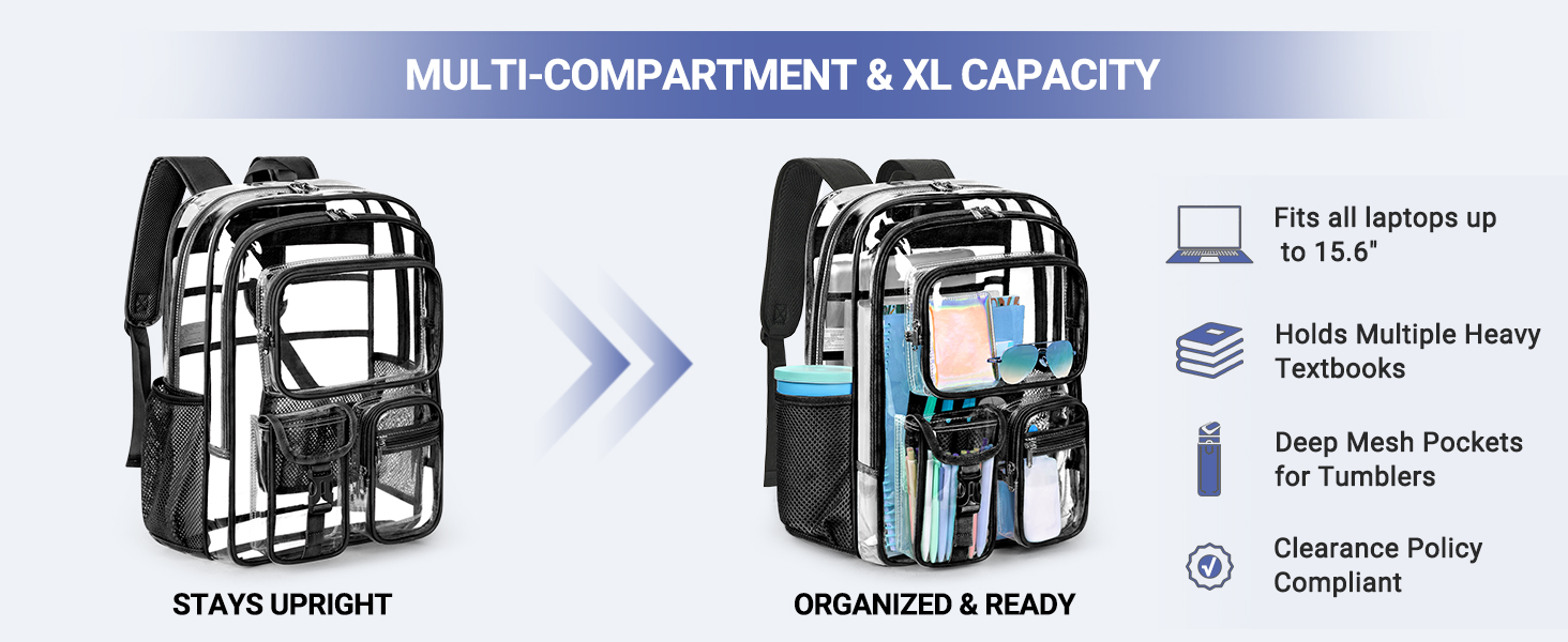 Reasonable Partitioning: 18.5 "H x 7.5" W x 12.5 "L, The transparent bag can easily accommodate most laptops and A4 folders. Equipped with 3 front pockets for storing mobile phones and keys; Mesh compartments can hold small items; The elastic pockets on both sides can hold water bottles or umbrellas