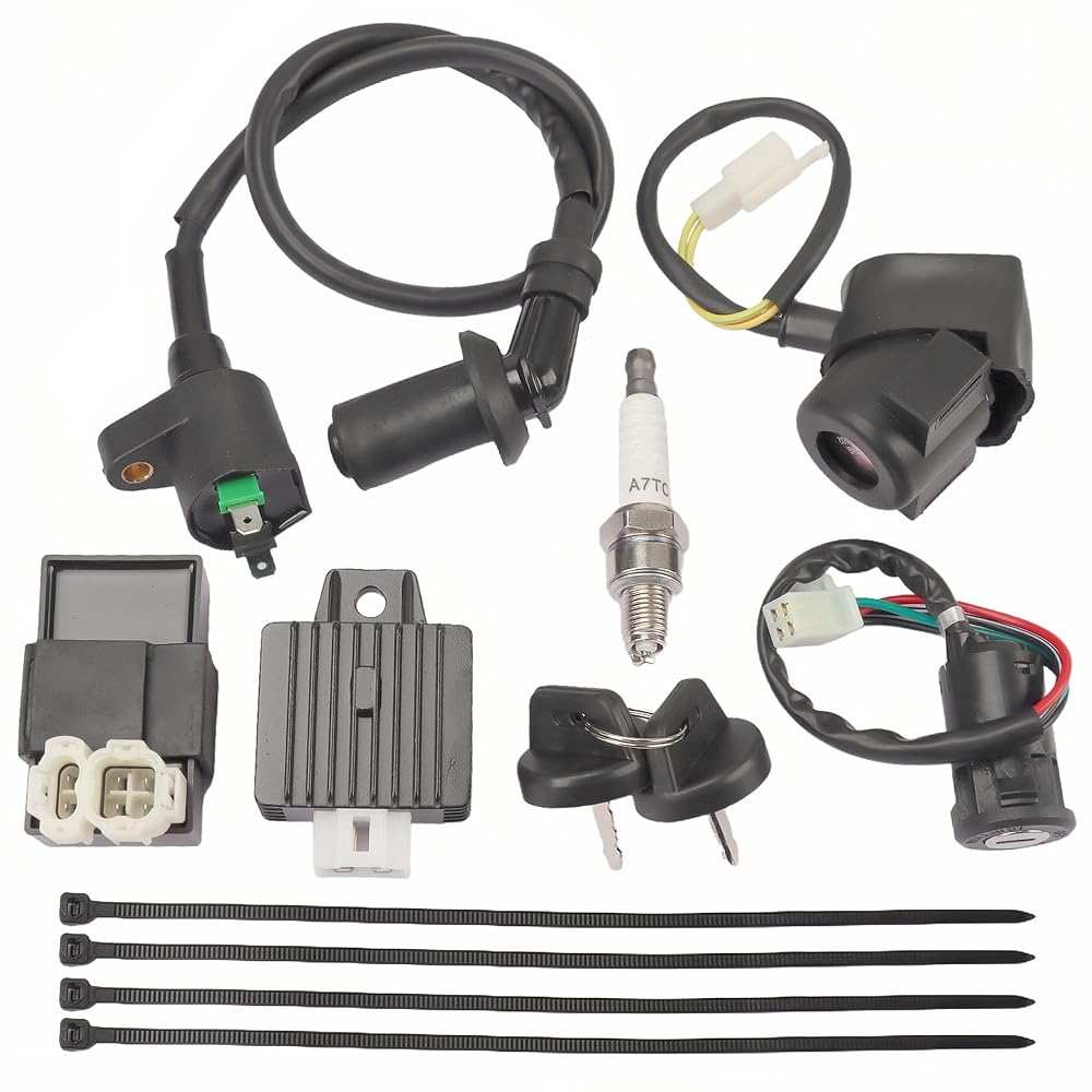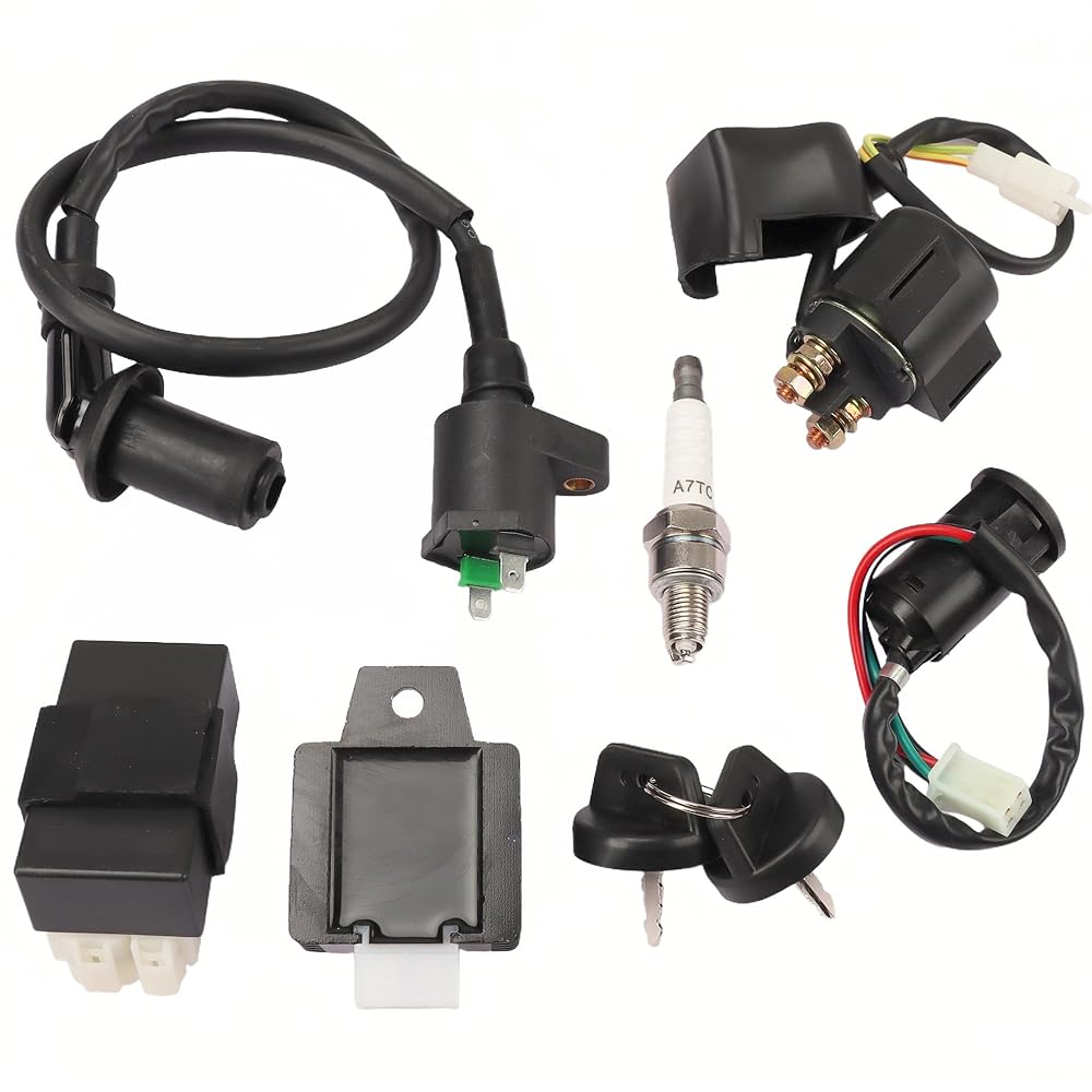 Package Inclued:1 x Ignition Coil, 1 x CDI Box, 1 x Voltage Regulator Rectifier, 1 x Relay Solenoid, 1 x Ignition Switch with 2 Keys, 1 x Spark Plug