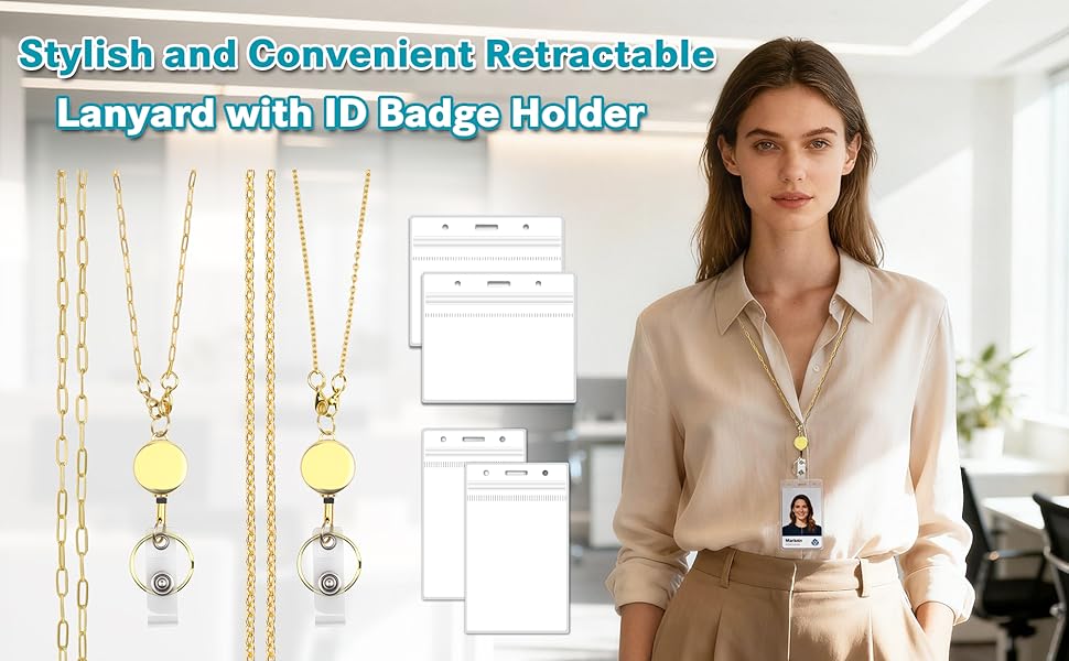 3 in 1 Gold Retractable Lanyards Set: Comes with 1 Gold lanyard with ID holder and 2 PVC ID holders (1 PC Rectangular and 1 PC Horizontal). They deliver a hassle-free way to carry ID badges and keys.