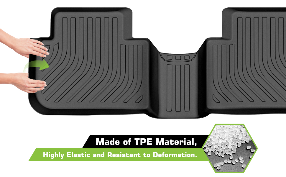 TPE Material: The floor mats is made from heavy-duty thermoplastic elastomer (TPE). They are highly resilient and resistant to deformation, even after being folded.