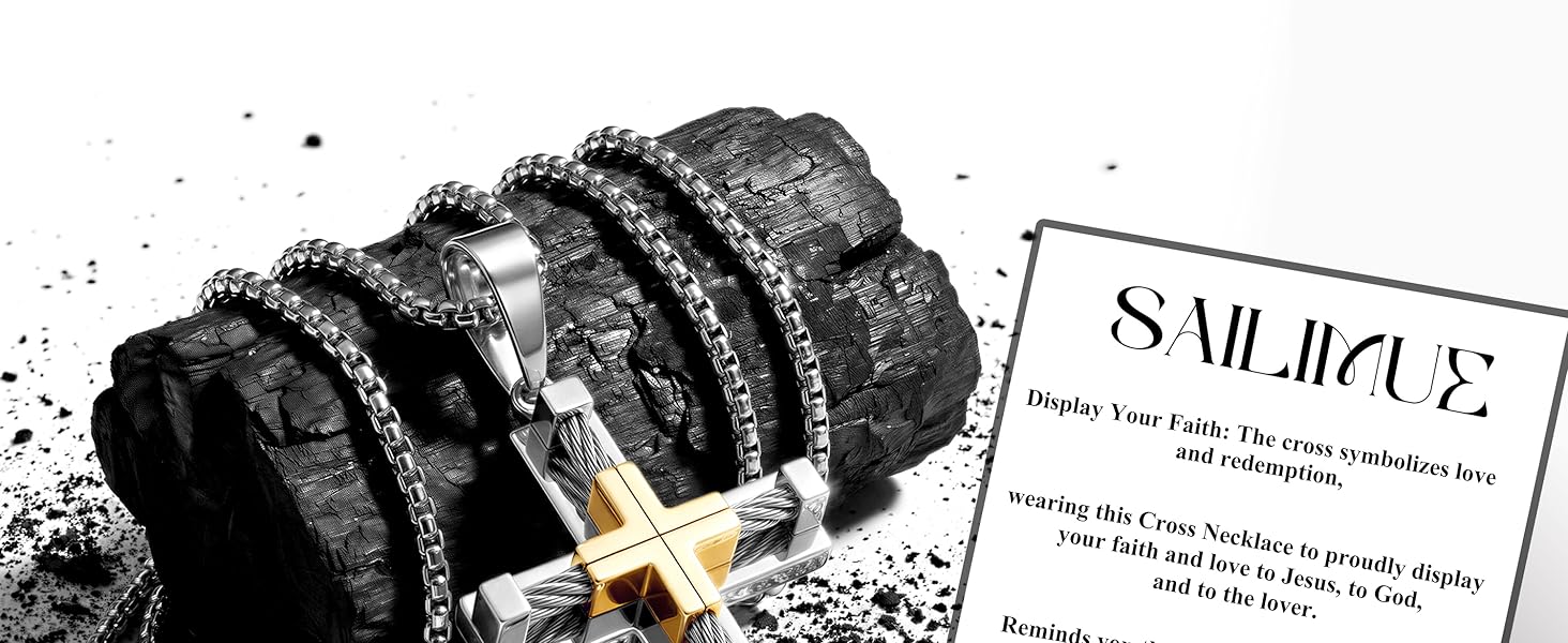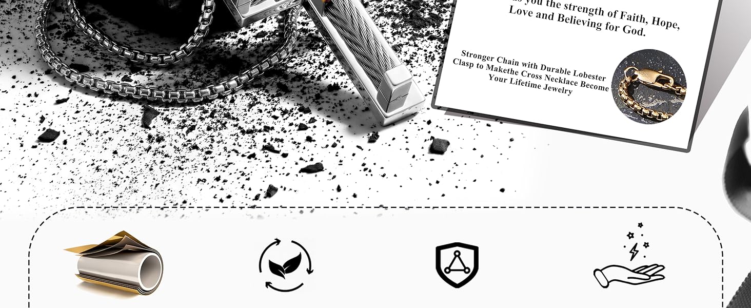 Stainless Steel Necklace : Both the cross pendants and the square rolo chains are made of 316L surgical stainless steel. These cross necklaces for men are hypoallergenic and rust-resistant, won't cause redness, itching, or irritation. This stainless steel chain necklace resists scratches, discoloration and wear. Whether you're exercising, showering, or out-door activities, this men's cross necklace will maintain its shine and shape for a long time