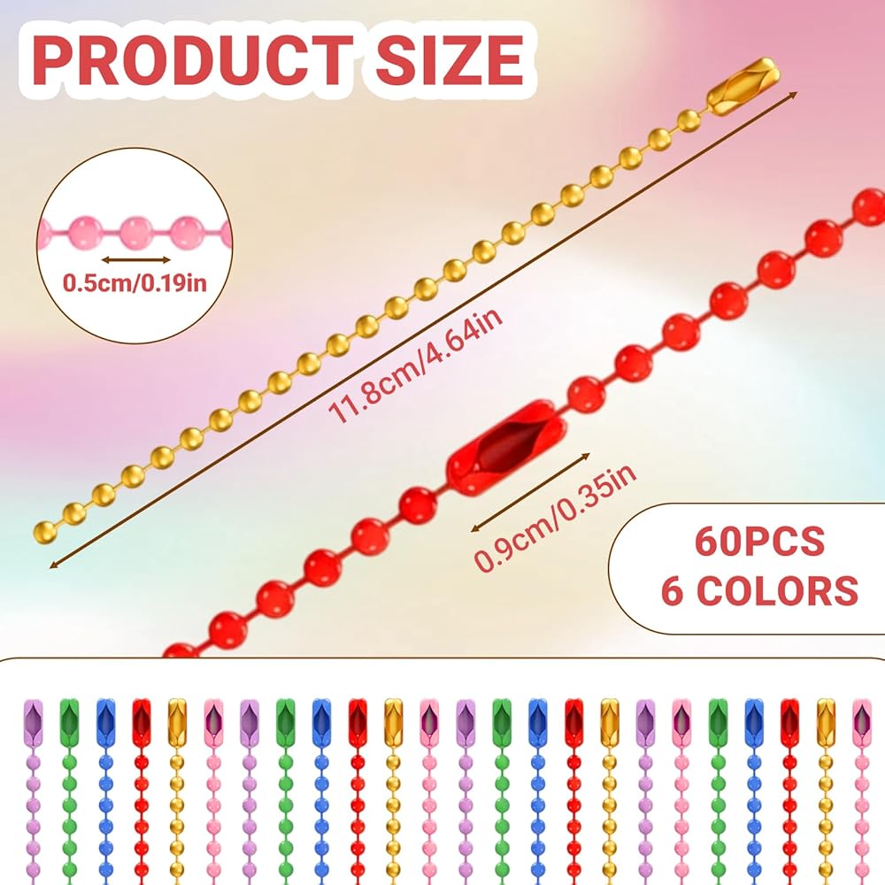 Packaging Includes: Your order includes a practical package of 60 individual ball bead chains in 6 colors(red, pink, blue, purple, gold, green). This quantity and colors is thoughtfully selected to provide an ample supply for multiple DIY endeavors, craft sessions, or small business needs, allowing for both creation and experimentation.