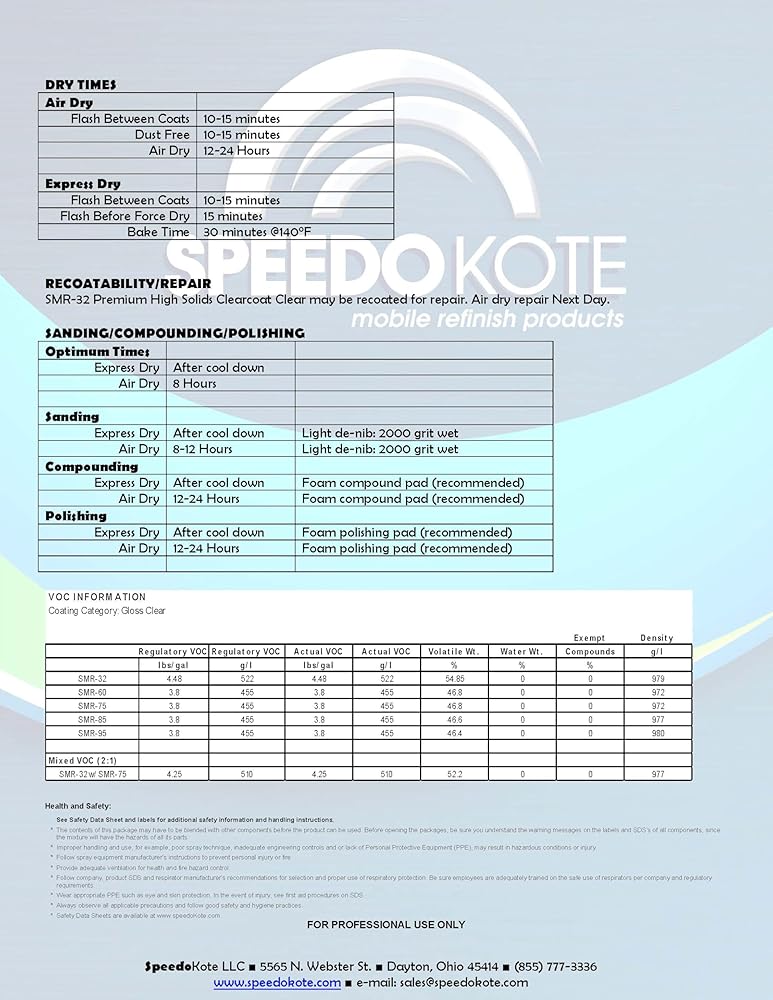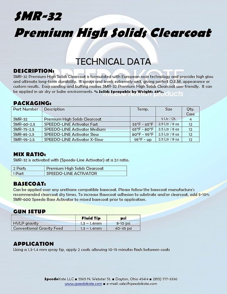 This sale is for a QUART KIT of Premium High Solids Clear Coat, 48 ounces when mixed 2:1, Medium Kit SMR-32/75-Q SMR-32 High Solids Clear coat has exceptional leveling characteristics, excellent gloss retention and D.O.I. It is formulated with innovative resins and UV stabilizers to provide a durable, long‐lasting finish.