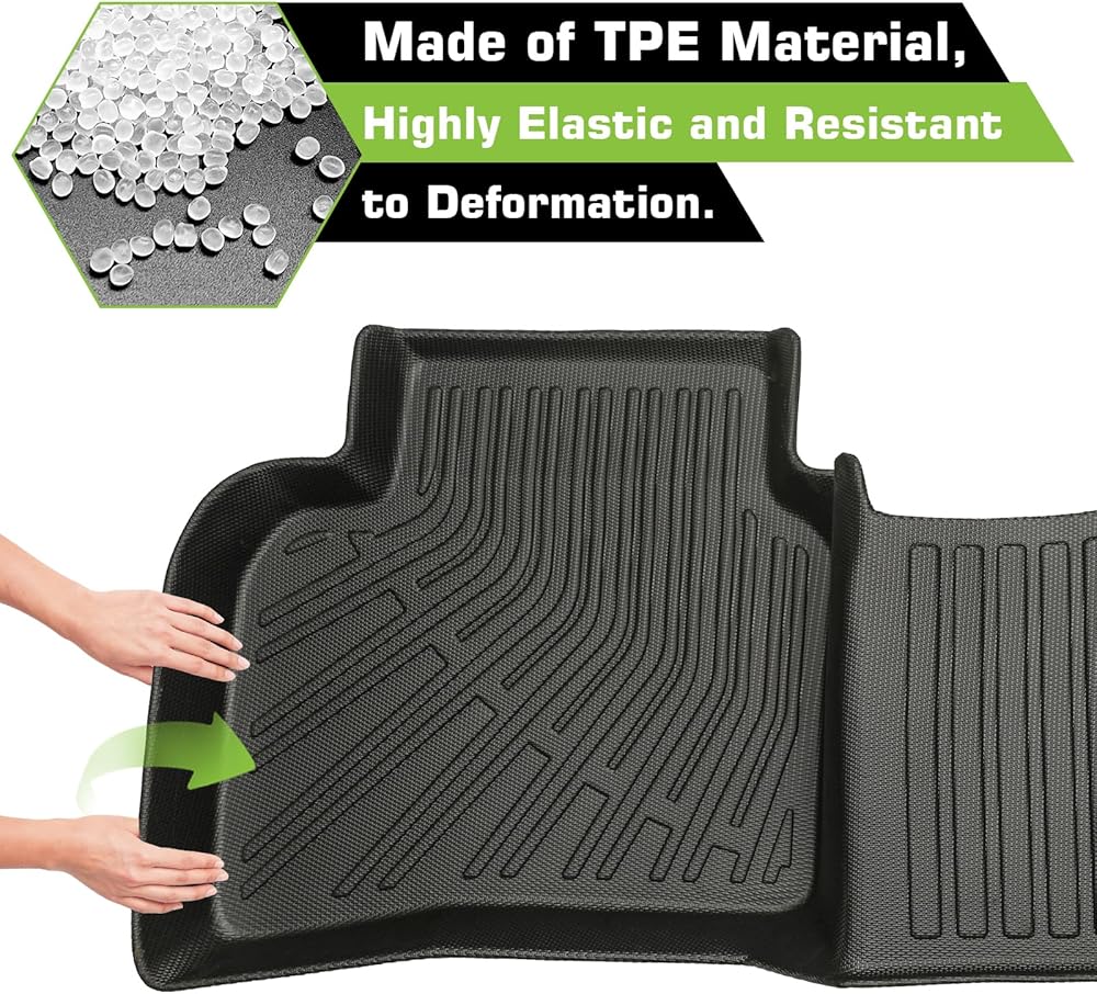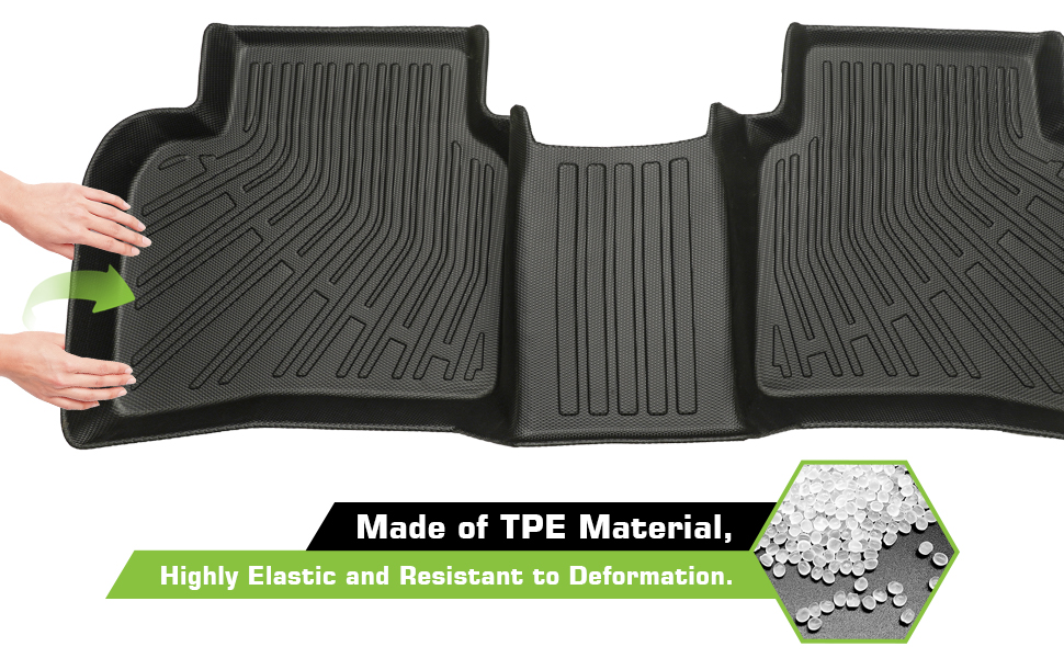 TPE Material: The floor mats is made from heavy-duty thermoplastic elastomer (TPE). They are highly resilient and resistant to deformation, even after being folded.