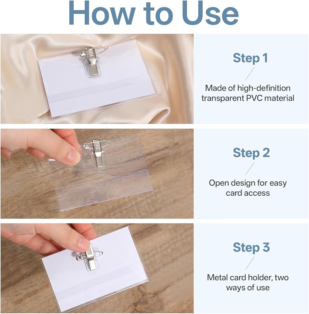 Easy to use: Name tag pins can be removed independently, just insert the card into the clip slot and then fix it on the clothing with the pin. The transparent window can quickly identify information without taking out the card