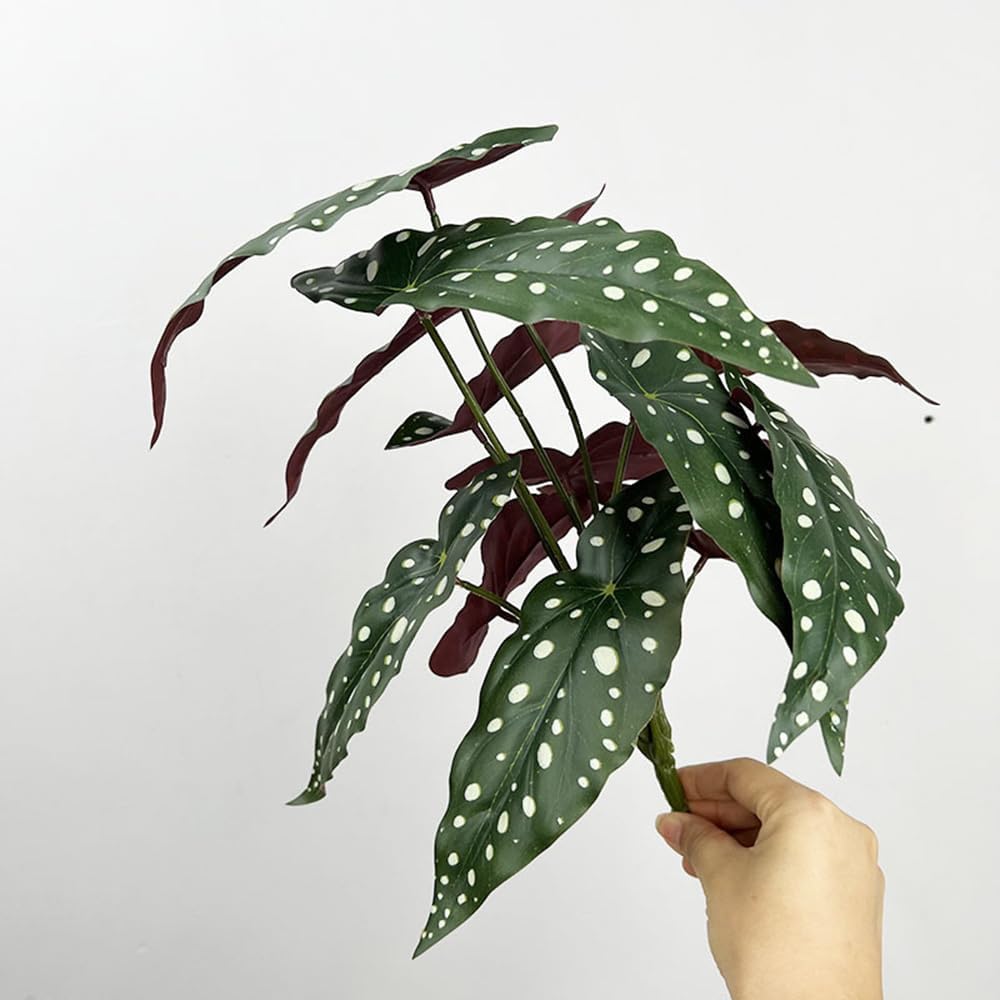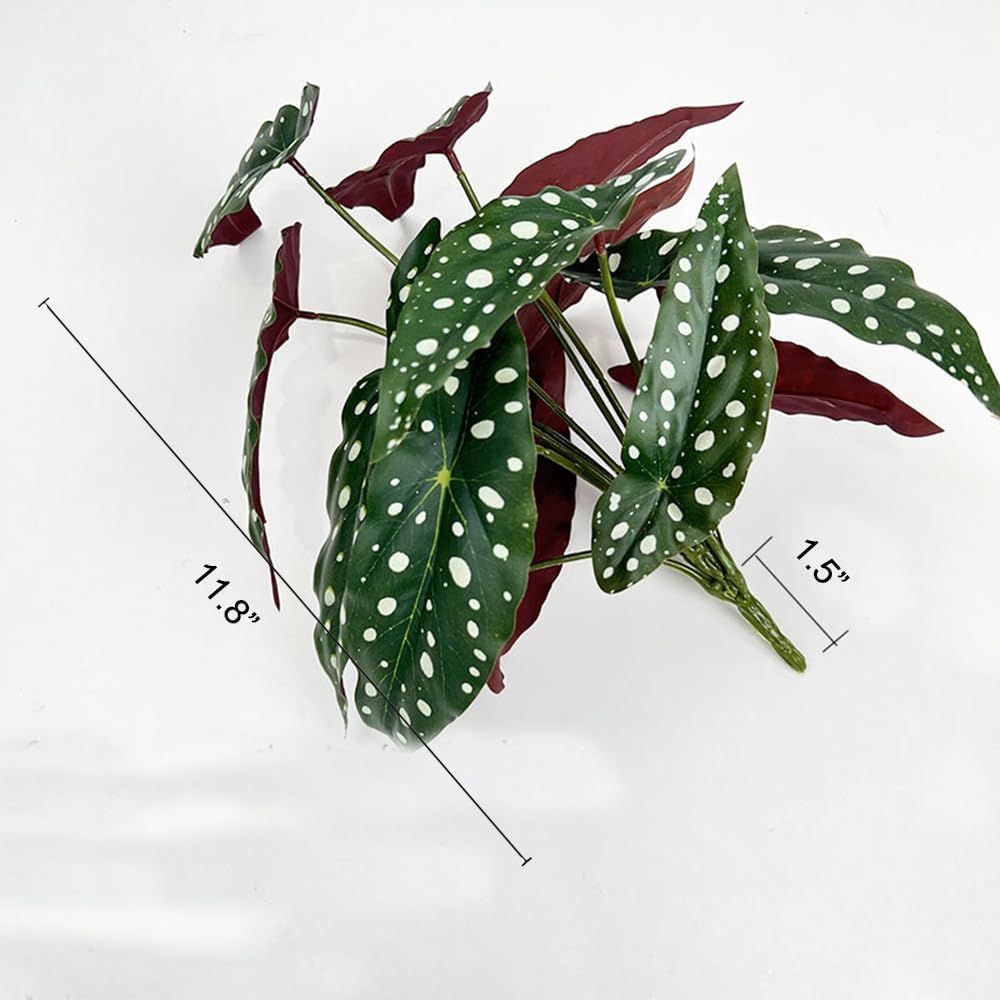 Package: Include 2pcs artificial polka dot begonia plant with 11.8" height. Each bundle has 12 heads leaves.