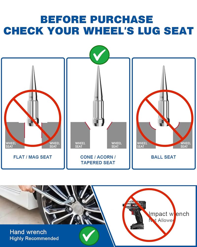 Fitment - Before ordering, please check the size of the 1/2”-20 lug nuts on the wheels. Only compatible with Conical/Cone seat and 1/2” 20 wheel Studs. If you are not sure whether these nuts are compatible with your car, please contact us.