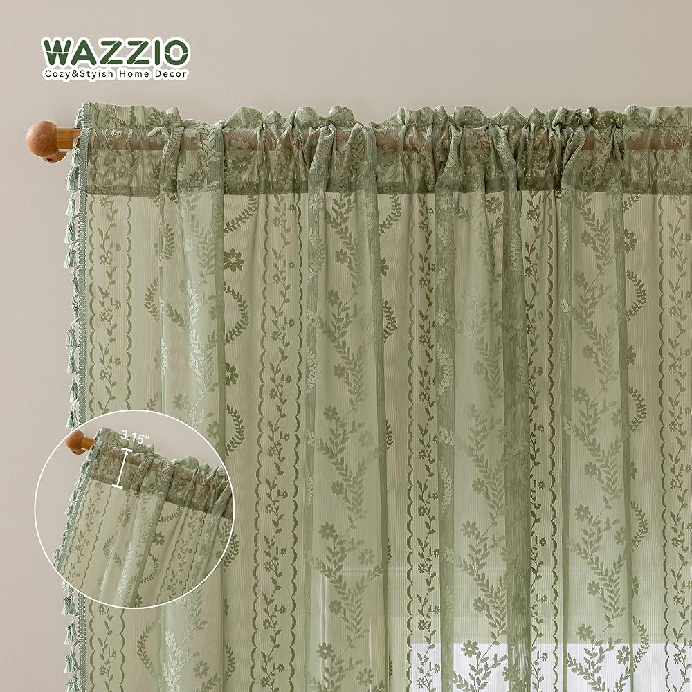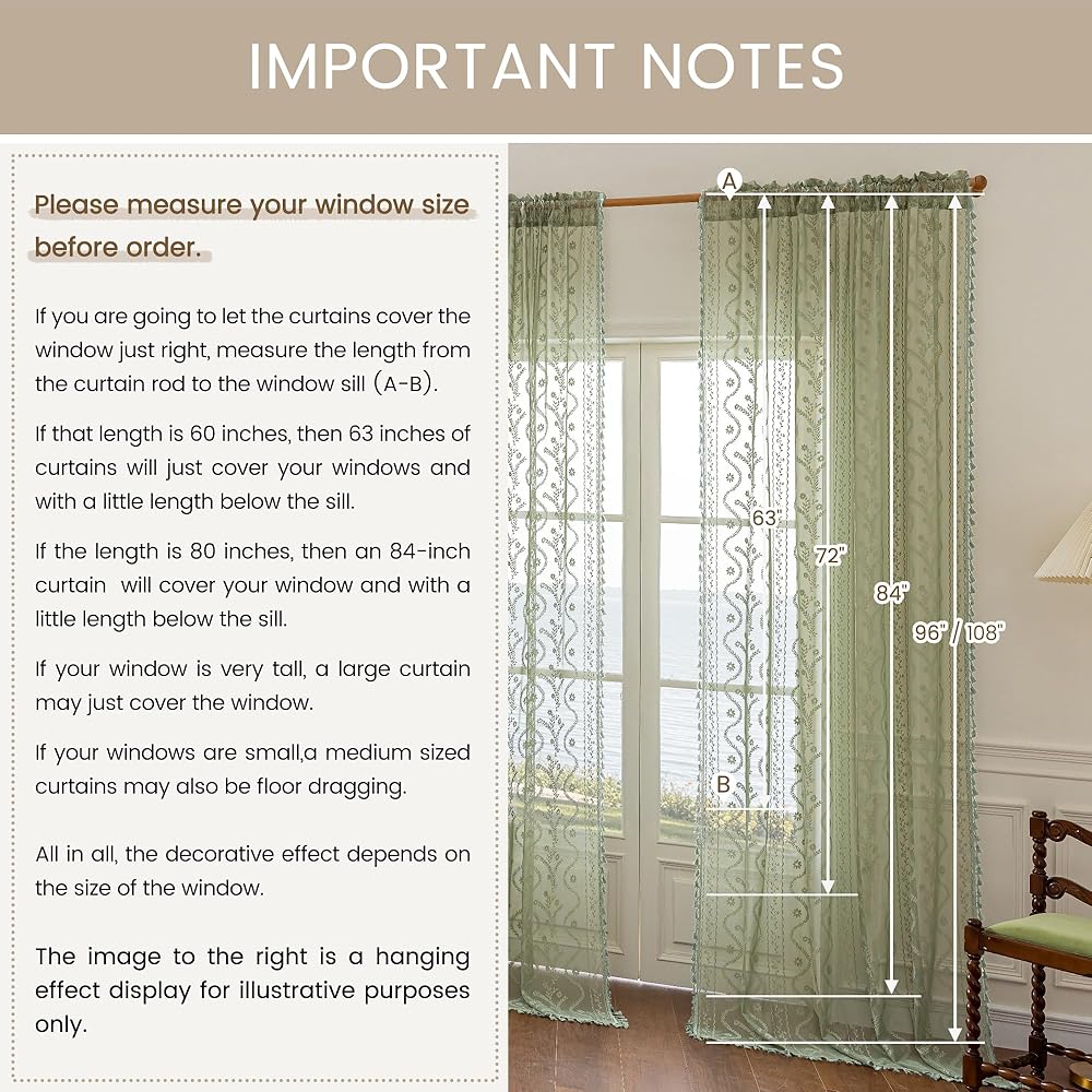 Package Includes:2 pack W52"xL63" lace sheer curtains (104" total width) with 3" rod pocket for easy installation,Compatible with standard rods ≤1.6" diameter,Ready to transform bedrooms/living rooms instantly