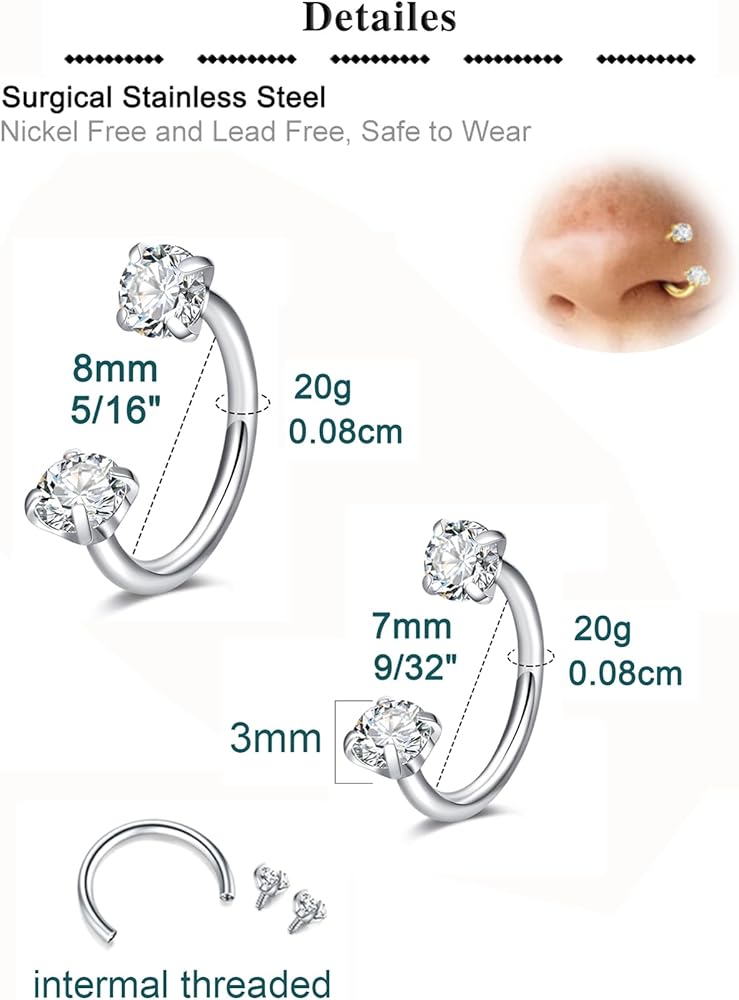 Material - This silver nose rings horse shoe nose rings for women hypoallergenic nose hoops with gems for women is made of stainless steel; Highly Polished 20g 7mm 8mm horseshoe nose ring 6mm helix earrings hoop cartilage earrings for women, Smooth Surface half hoop nose ring double stud nose rings labret lip piercings for women are comfortable for long time wear.