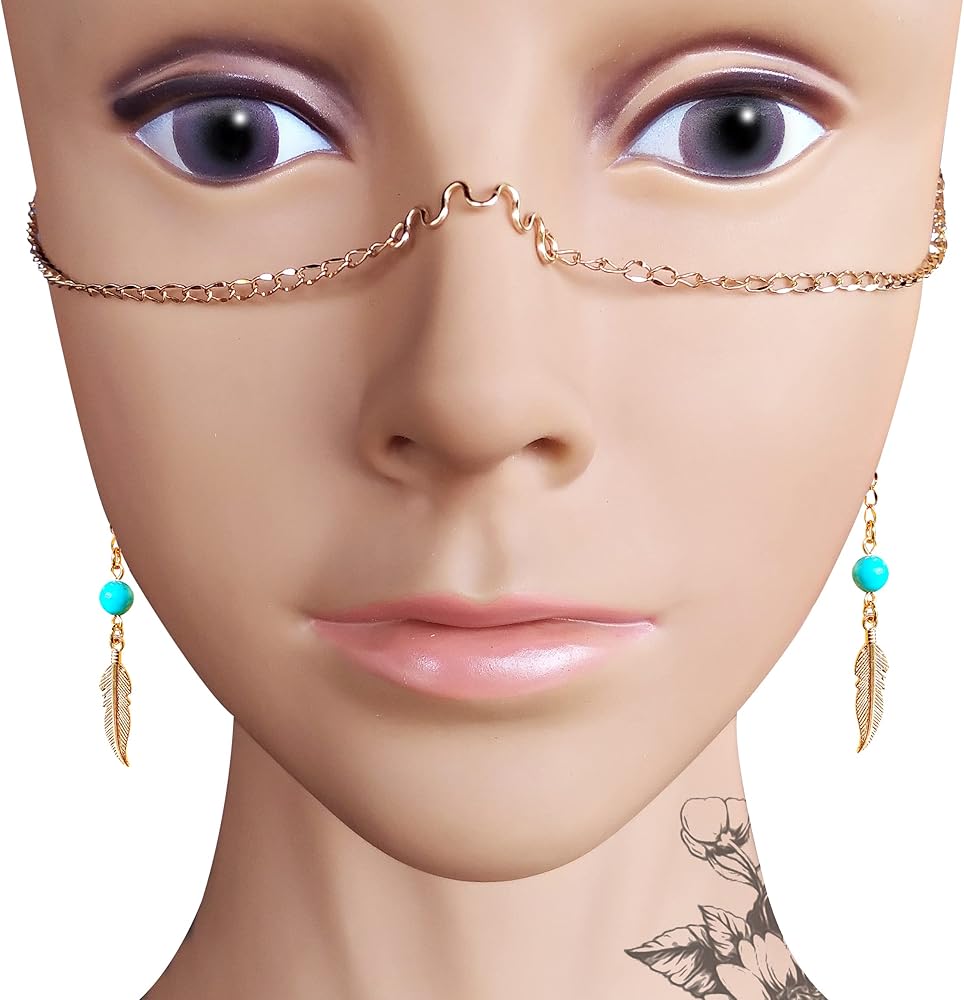 - This face chain is made with gold stainless steel chain, two turquoise beads and two gold feather charms