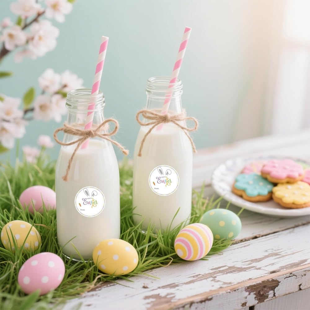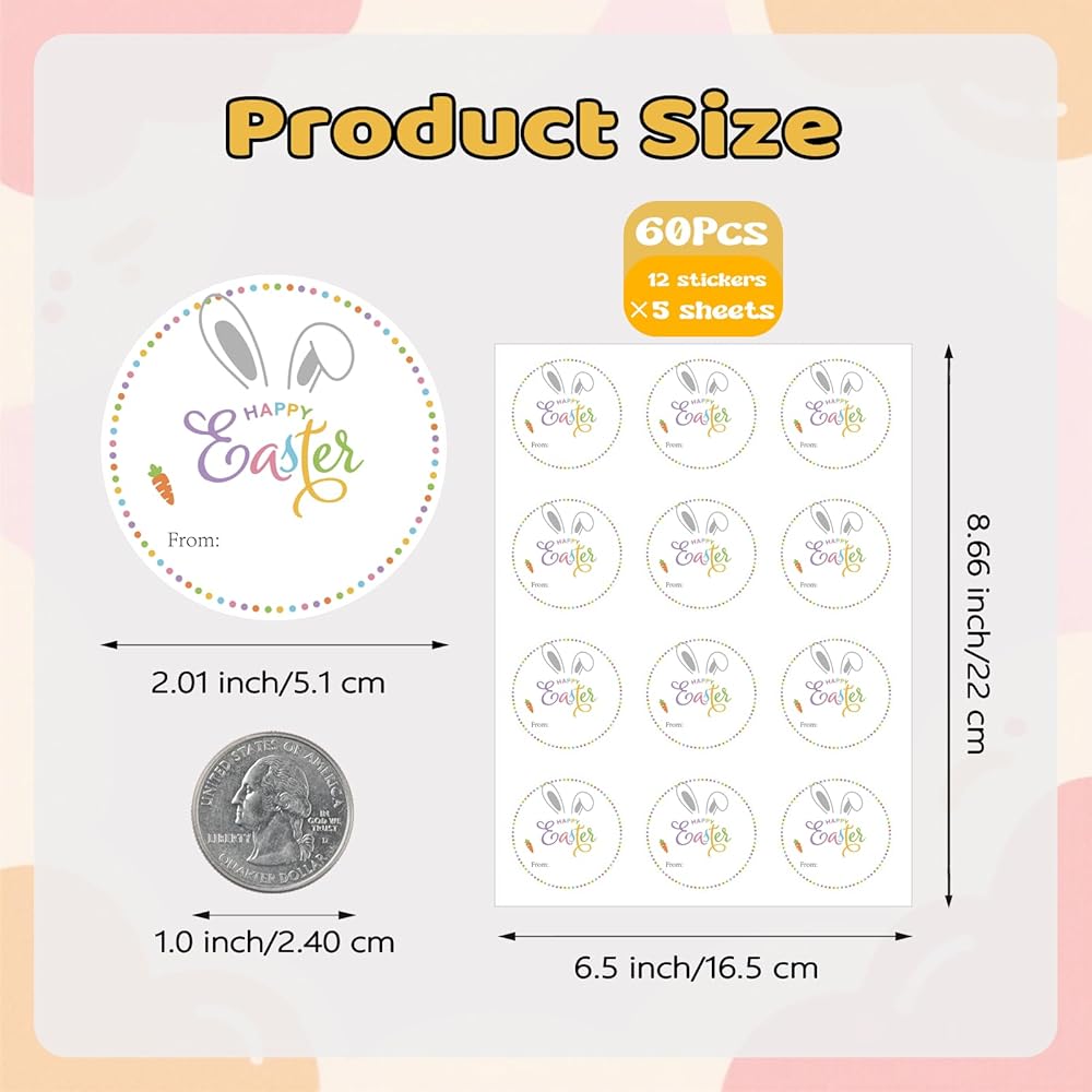 [Generous 60-Pack Set] This value-packed set includes 60 premium-quality easter stickers for kids and adults, all neatly organized on easy-to-use sheets. Each sticker is 2 inches in diameter, round in shape, and comes with a "From:" label for personalization. You'll have plenty of bunny stickers to decorate eggs, gifts, and more throughout the holiday, ensuring no project goes unfinished.