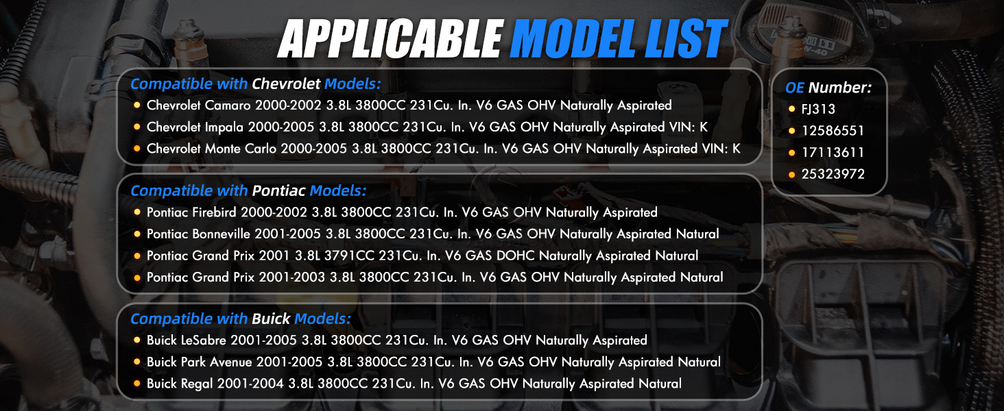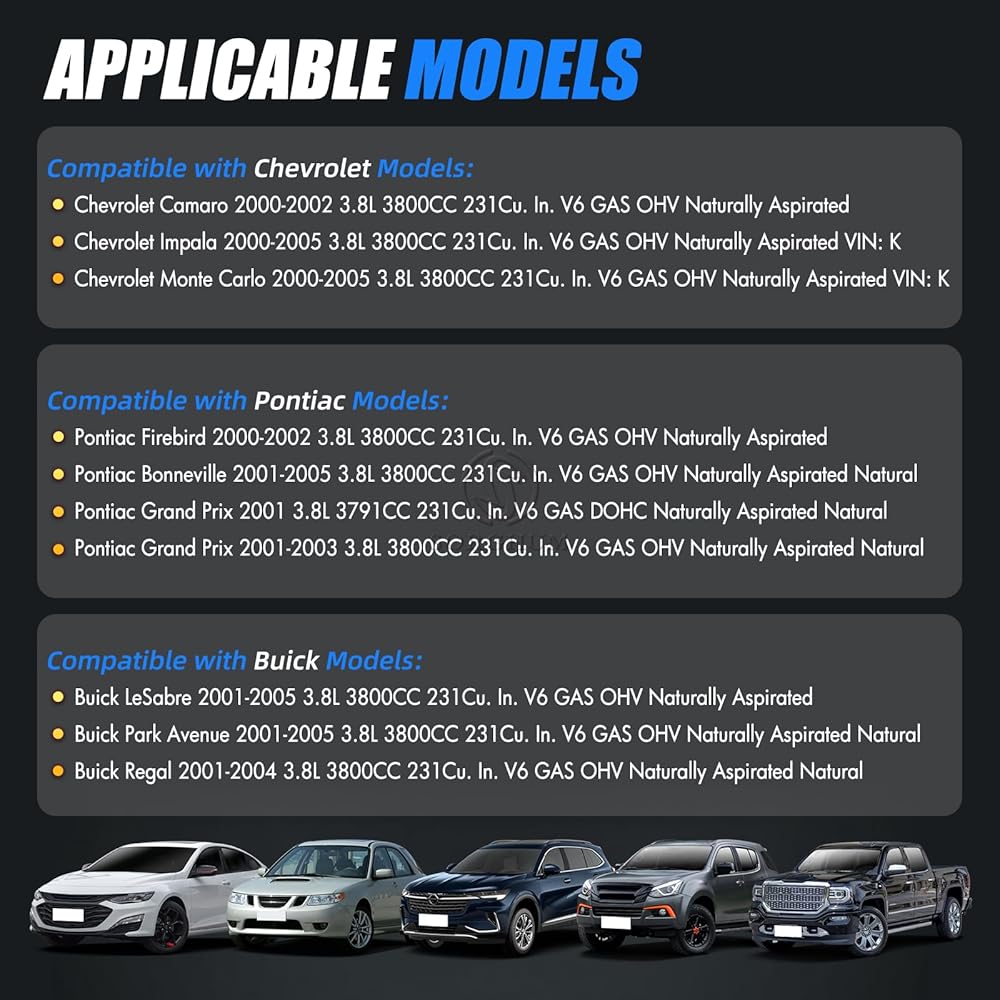 [Fitment] - Engine may affect fitment. Please use "amazon confirmed fit" above to verify specific vehicle fitment details before purchasing - Compatible with Chevrolet Camaro 2000-2002, Impala/Monte Carlo 2000-2005, Pontiac Firebird 2000-2002, Bonneville 2001-2005, Grand Prix 2001-2003, Buick LeSabre/Park Avenue 2001-2005, Regal 2001-2004. *3.8L V6/OHV/DOHC Naturally Aspirated Natural* |Fuel Injectors Set of 6|