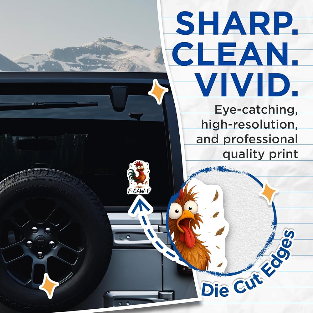 These are not multiple packs with different designs. Each pack contains two stickers of the same design. You will receive two identical stickers in one pack. Elevate your belongings with these hilarious chicken stickers, designed to add a touch of humor to your everyday life. Each sticker showcases a comical rooster, perfect for those who appreciate lighthearted and unique designs. Place them on laptops, journals, water bottles, or any surface that needs a dash of personality. Ideal for adding a fun vibe, these stickers are more than just decoration, they are a conversation starter. Bring a smile to anyone's face with this amusing poultry depiction. The expressive design ensures that your belongings stand out, reflecting your fun sense of humor. These are great for personalizing your items or sharing a comical expression with others. Embrace the silly side of life, one sticker at a time.