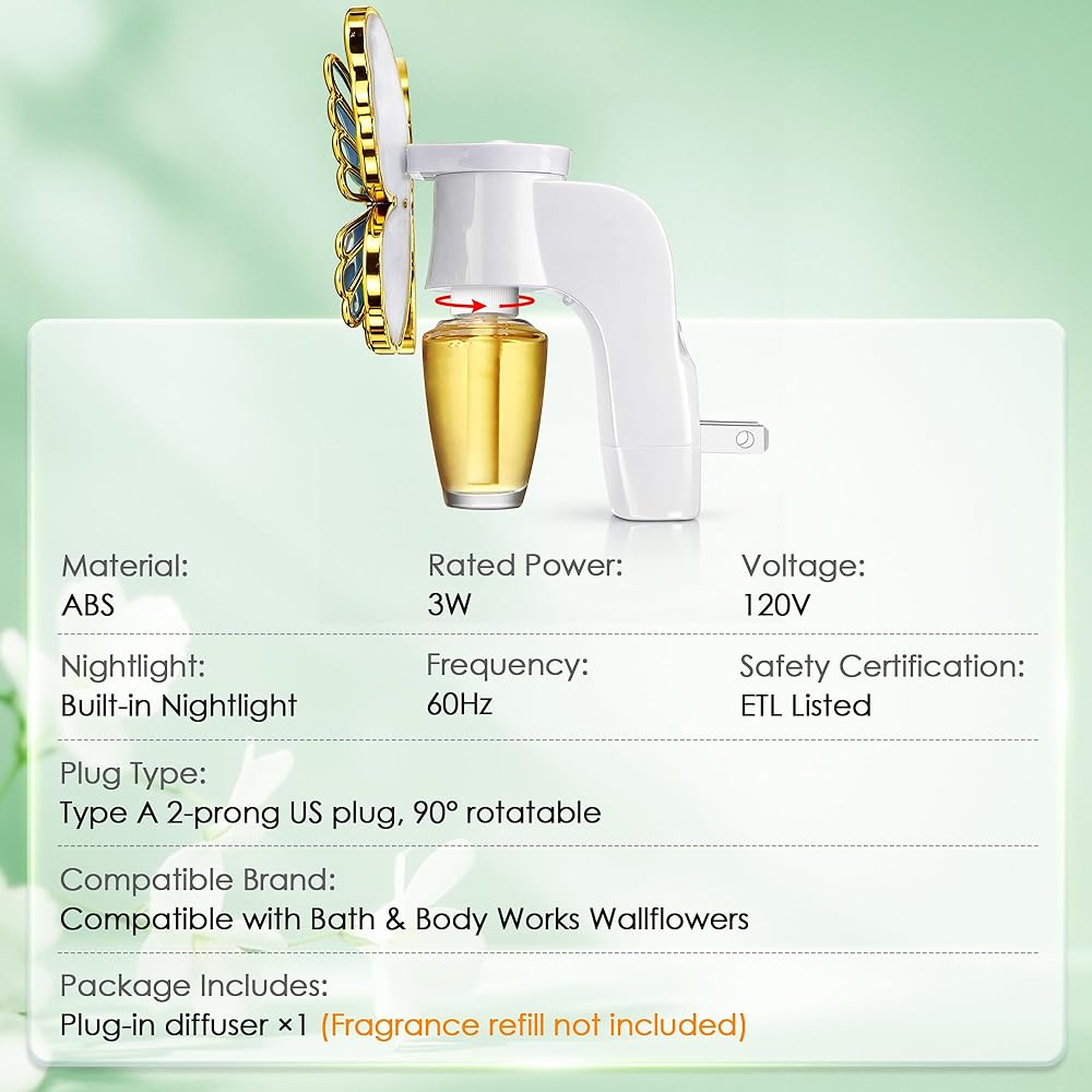 This plug-in fragrance diffuser is designed to enhance your home environment with soothing aromas and a gentle night light. Compatible with Bath & Body Works Wallflowers refills, it delivers long-lasting fragrance while adding a decorative touch to any room. Package Contents 1 x Plug-in Fragrance Diffuser Note: Diffuser only, fragrance refills not included. Usage Tips For optimal fragrance diffusion, place the diffuser in a well-ventilated area. Use only compatible Wallflowers refills to ensure safe and effective operation. Turn off the diffuser when not in use for extended periods. Keep away from water or moisture to avoid electrical hazards. Safety Precautions This product is ETL certified and meets North American safety standards. Equipped with overheat protection to prevent damage from prolonged use. Do not attempt to disassemble or modify the diffuser. Customer Support For any questions or concerns, please contact our customer service team via your purchase platform. We are committed to ensuring your satisfaction and a pleasant fragrance experience
