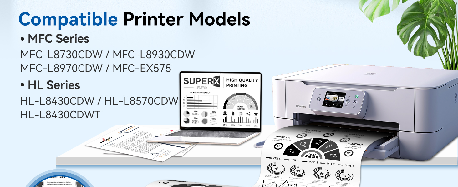 Printer Compatible for use with: TN635 TN635XL toner cartridge replacement for Brother HL-L8430CDW HL-L8430CDWT HL-L8570CDW MFC-L8730CDW MFC-L8930CDW MFC-L8970CDW MFC-EX575 series printer for TN635XL toner cartridges set