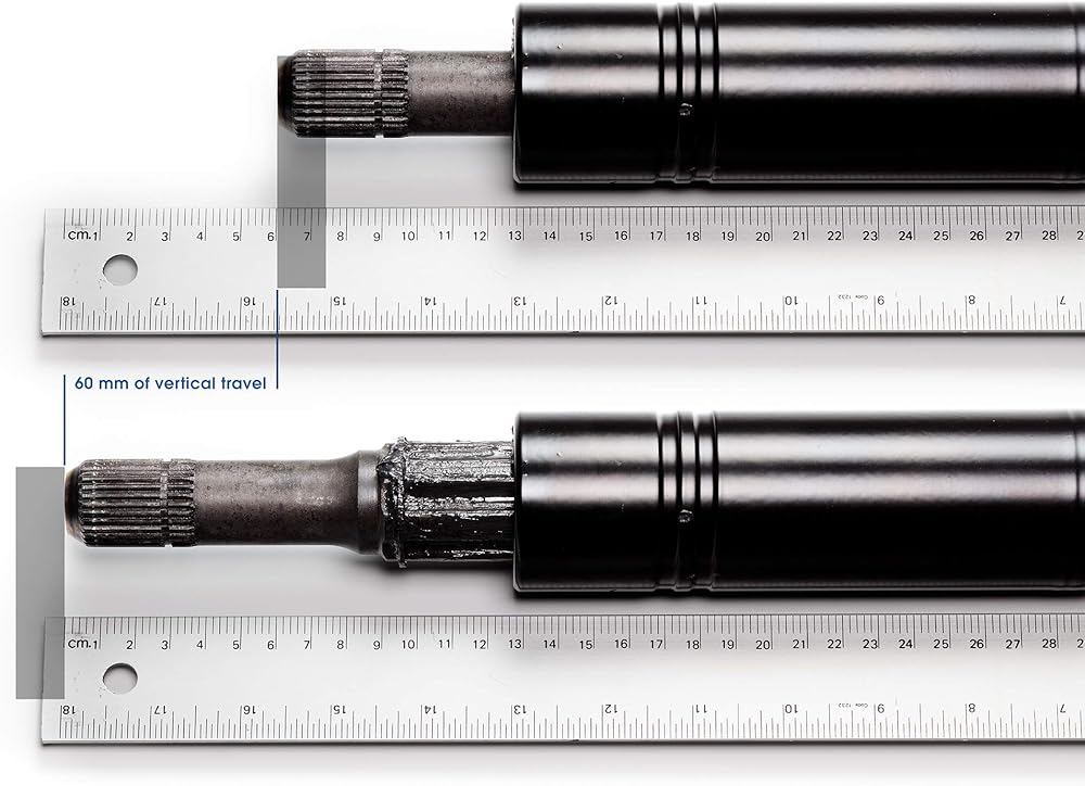 Works on stock setups, helps support larger tires, and can accommodate lift kits up to 4". Dual articulating joints allow for a greater range of motion, keeping the tires in contact with the ground. Add a 60 mm extension built into a 4340 chromoly steel shaft and now you have more range and traction without overstressing those joints, which are usually the problem areas.