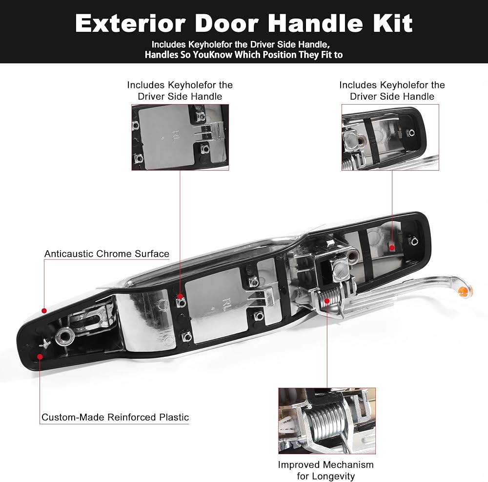 Good Quality:The front rear driver and passenger side exterior door handle is made of plastic and chromium materials, with precise processing and strict testing to ensure the durability and reliability of the product. This product can perfectly replace OE parts. And this product has passed factory inspection.