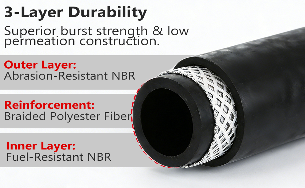 ⭐Premium Construction - This heavy-duty 3/4 fuel hose features a 3-layer design with dual NBR tubes and braided polyester for superior strength and flexibility in demanding applications.