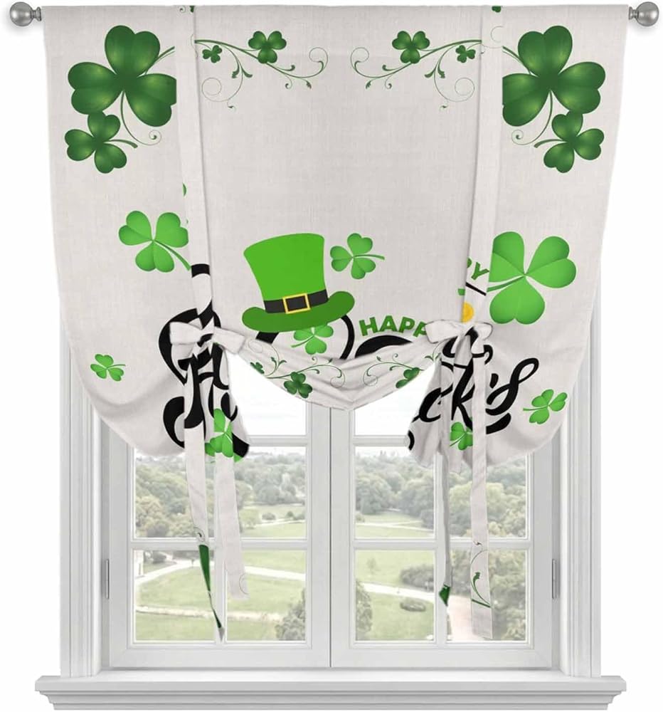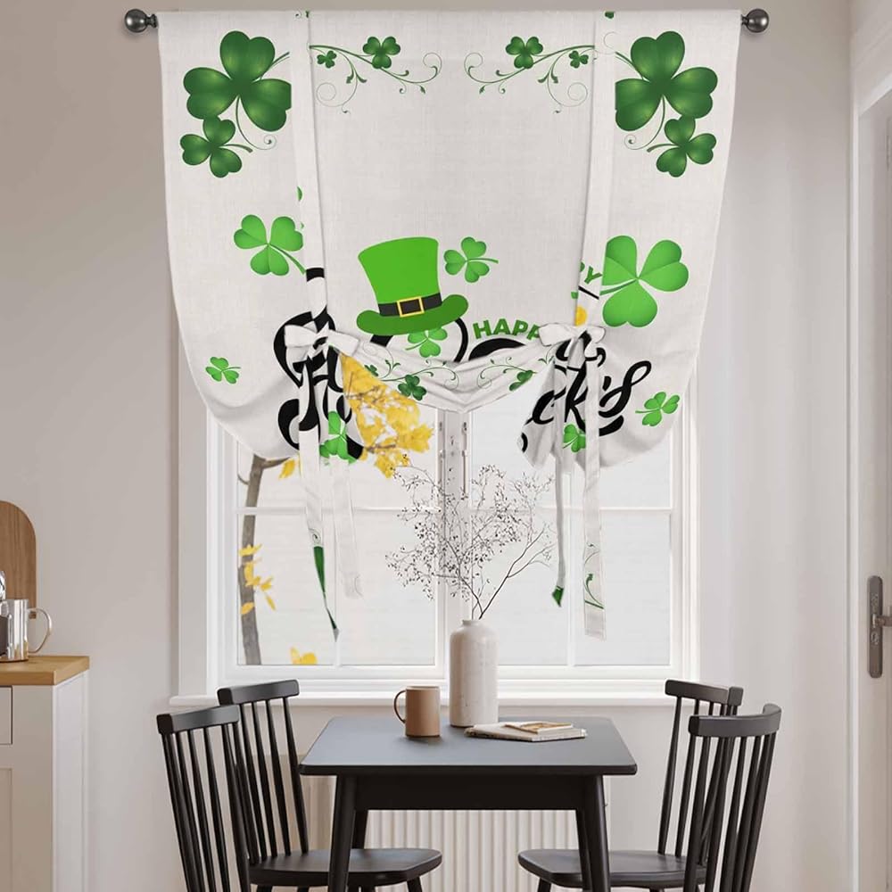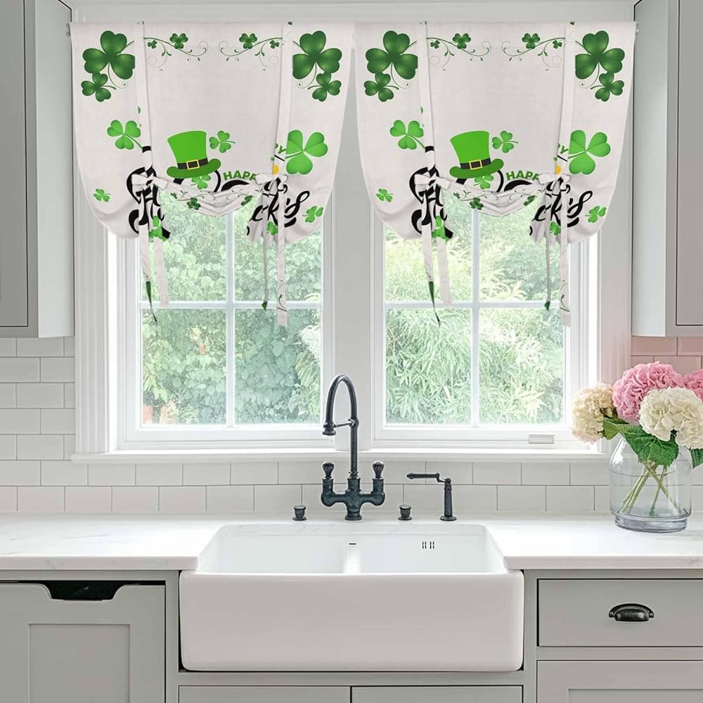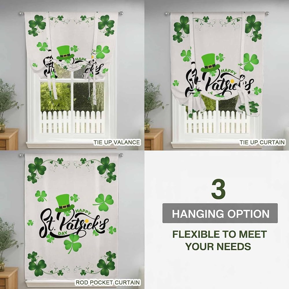 Happy St. Patrick's Day Tie Up Curtains for Window, Lucky Shamrocks Grass Hats Thermal Insulated Balloon Shade Adjustable Rod Pocket Curtains Valance Panels for Kitchen Bathroom Café 52'' x 63''