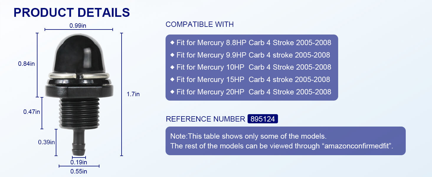 Compatible With:Fuel pump primer bulb compatible with 2005-2008 Mercury 8HP 9.9HP 10HP 15HP 20HP Carb 4 Stroke