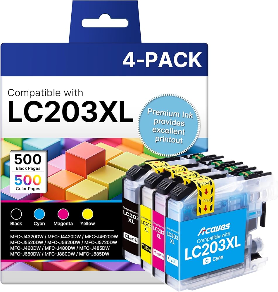 Package Includes: Acaves LC203XL 4-Pack for brother lc203 ink cartridges, including 1 black LC203XL ink cartridge, 1 cyan LC203XL ink cartridge, 1 magenta LC203XL ink cartridge, 1 yellow LC203XL ink cartridge, plus 1 user guide (NON-OEM Cartridges)