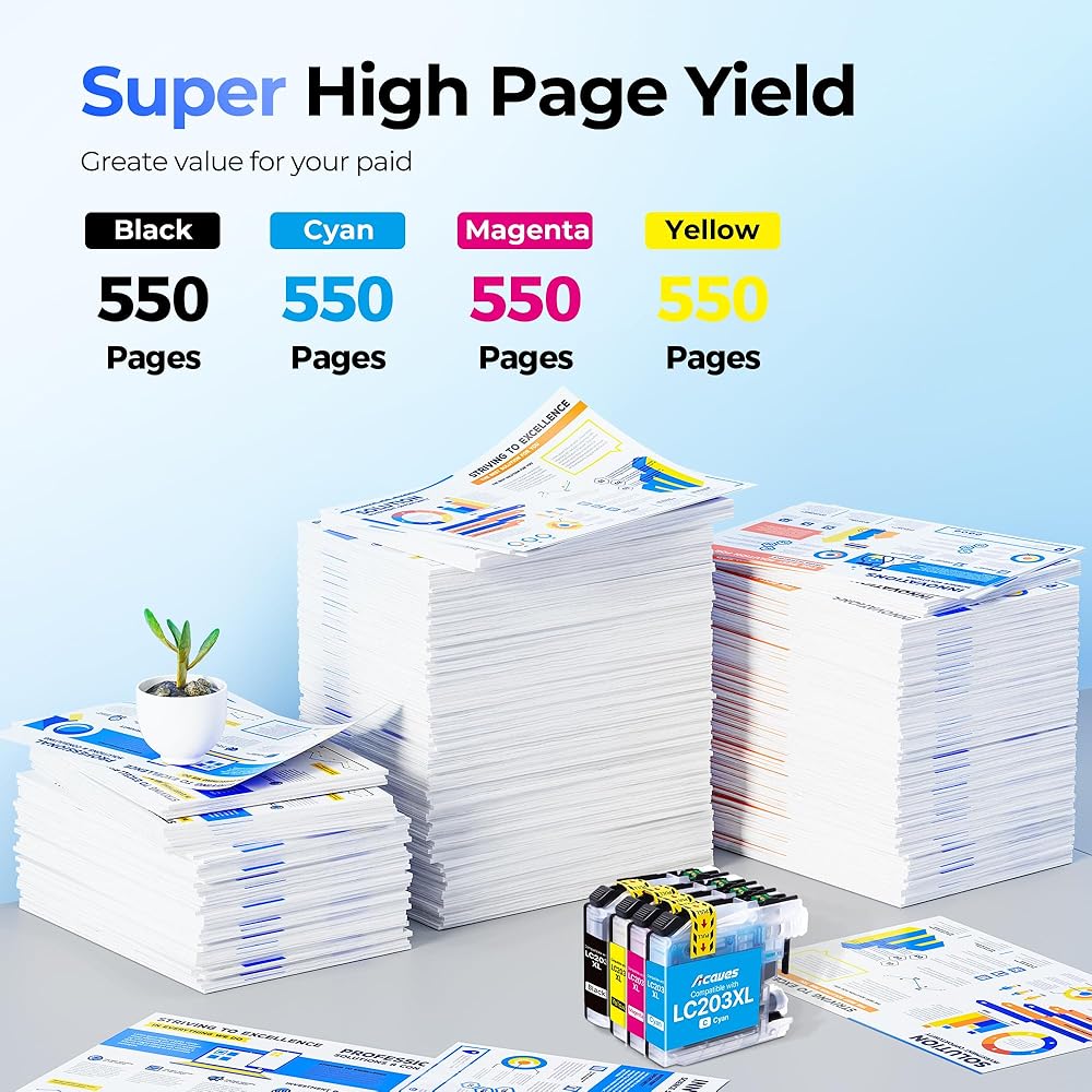 High Page Yield: LC203XL ink cartridges for brothers printer offer 550 pages per LC203XL black cartridge and 550 pages per LC203XL color cartridge (tested at 5% ink coverage on standard A4 paper)