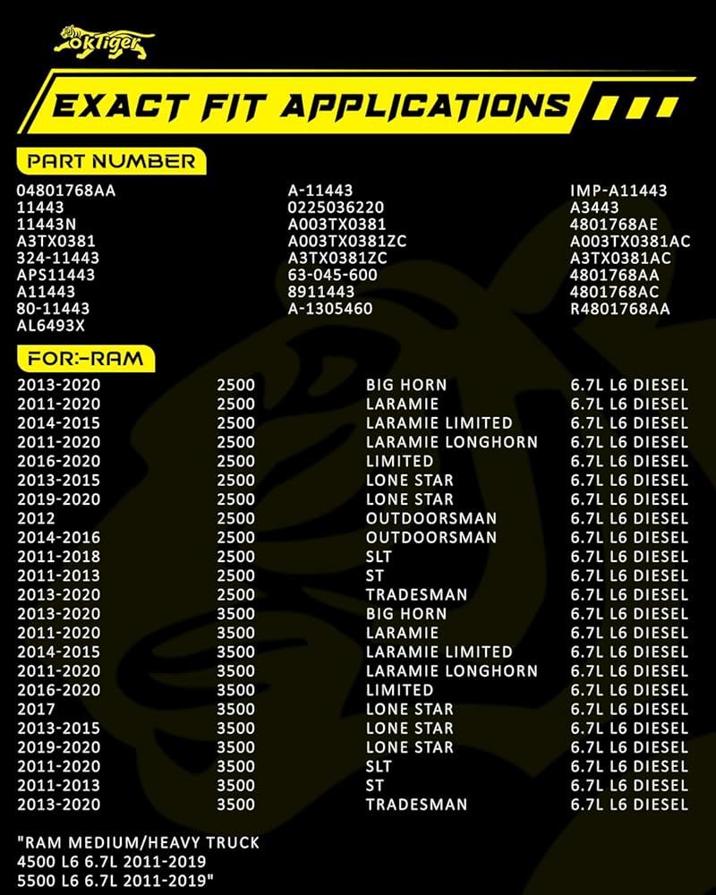 • Fitment: Compatible with RAM 2500 2011-2020 6.7l l6 diesel; 3500 2011-2020 6.7l l6 diesel; 4500 2011-2019 6.7l l6 diesel; 5500 2011-2019 6.7l l6 diesel