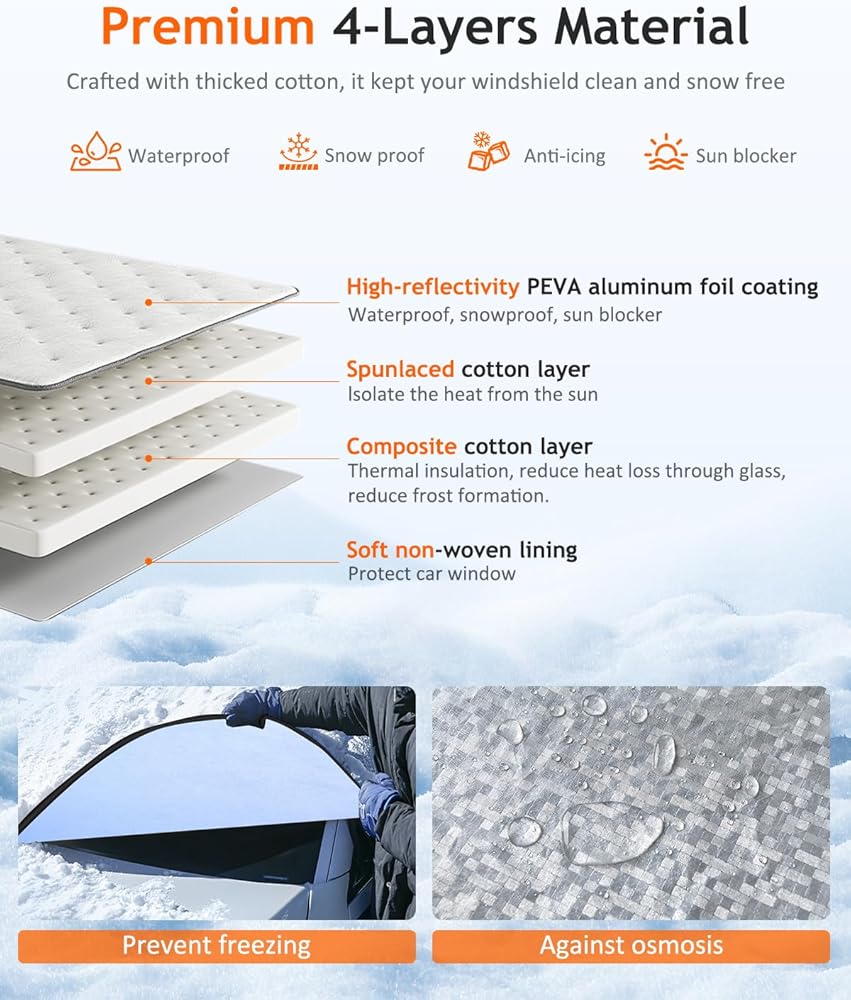 Tecoom Automotive Windshield Snow Cover for Ice, 4-Layer Windshield Protection in Winter, Waterproof Auto Window Sun Shield, Portable All Weather Frost Guard Shield Universal for Car SUV Van 68.5"x47"