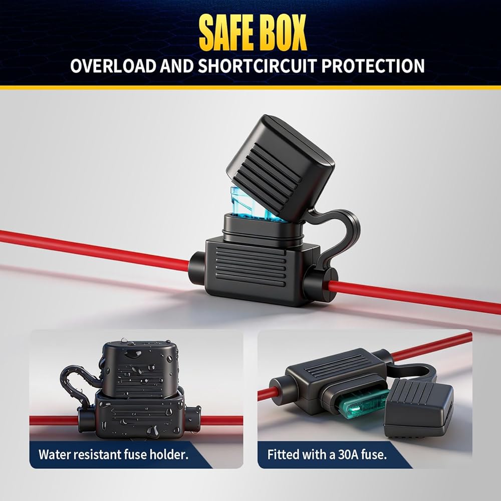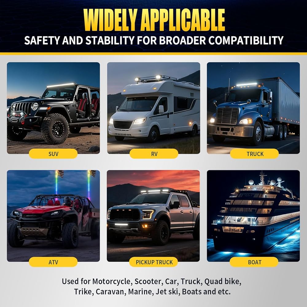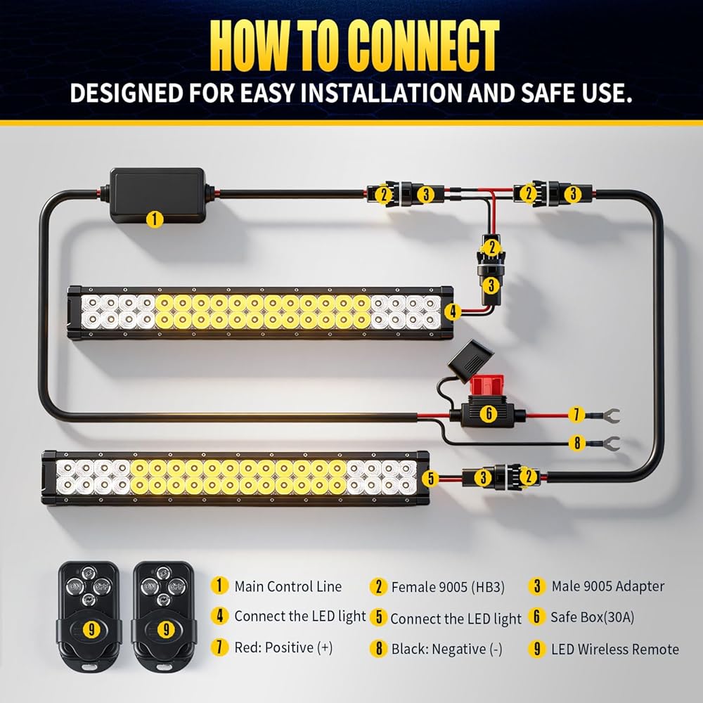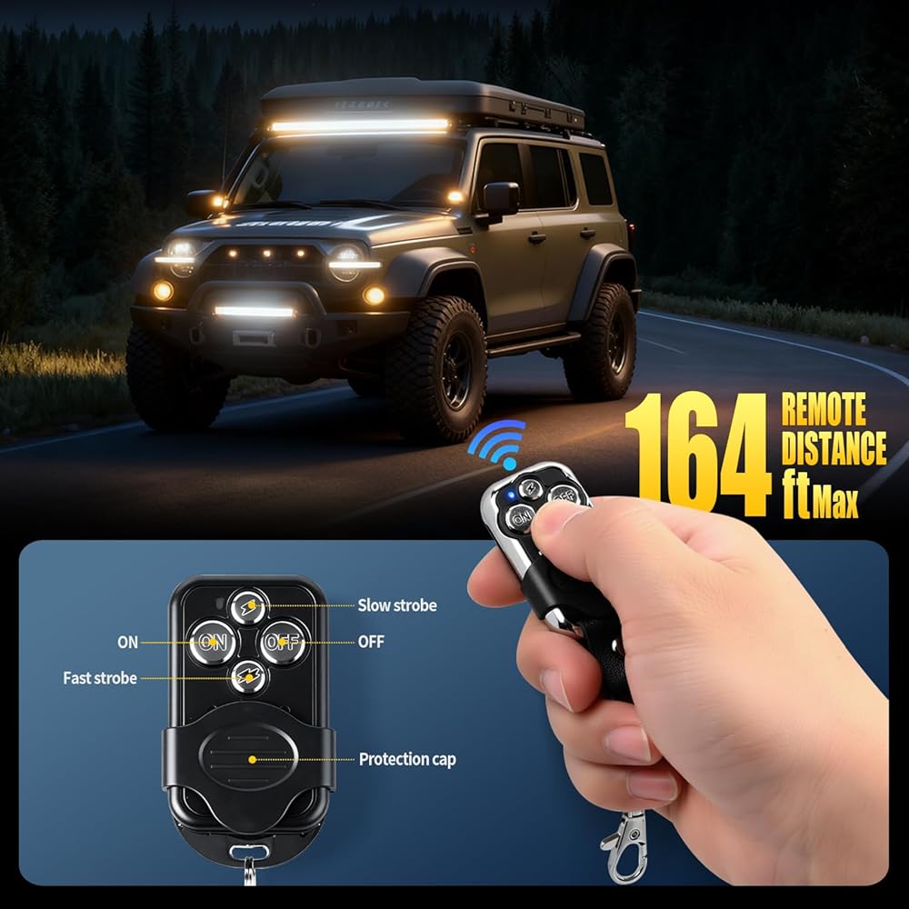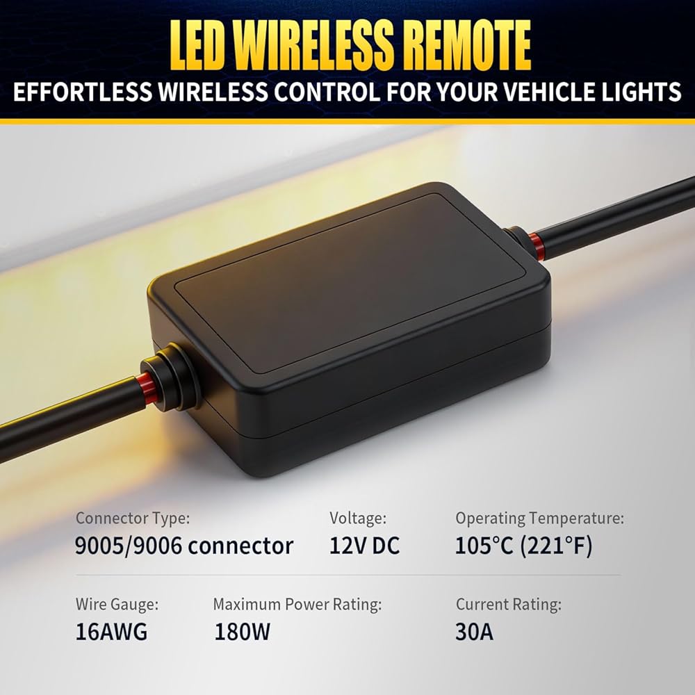 Enhance your vehicle's lighting with our innovative LED Light Bar Remote Control Wiring Harness by Jihe. This 16AWG wiring harness kit is designed to work with LED light bars, fog lights, and driving lights, providing multiple control modes including on, off, zig-zag flash, strobe, and pulsing. The wireless remote control system is easy to install, with no drilling or modifications required, and can be used for most cars, jeeps, trucks, pickups, SUVs, and 4x4s. The control box is waterproof and can be installed in an appropriate position for optimal wireless signal reception. This product is backed by a 12-month guarantee. Please refer to the wiring diagram for installation instructions.
