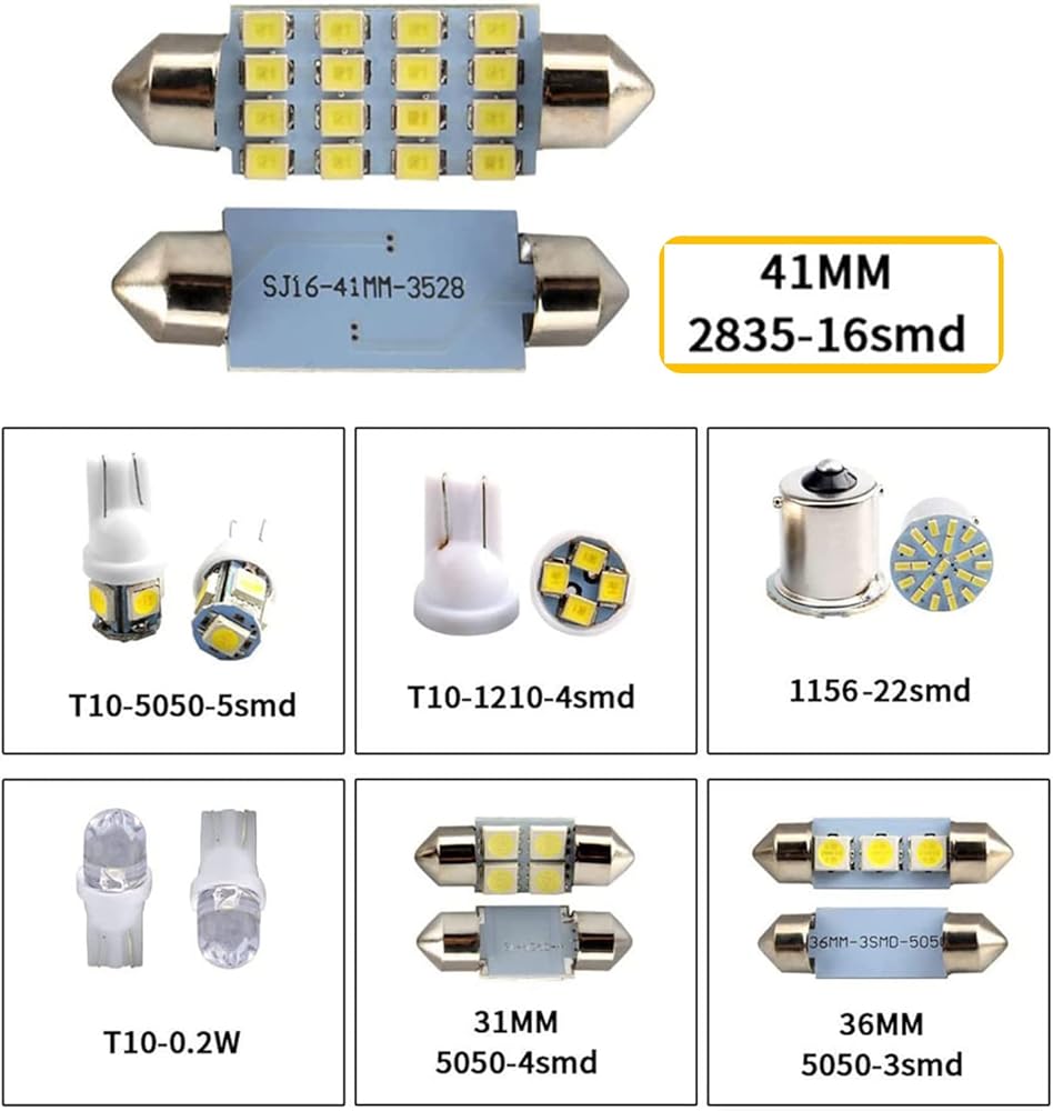 Package Includes: 42 pieces of LED interior car lights in 7 models, each model has 6 pieces, contain 31 mm, 36 mm, 41 mm, 1157 bulbs, T10 bulbs and T10-1210 bulbs, T10-5050 bulbs. Various enough to satisfy your different demands in daily life.