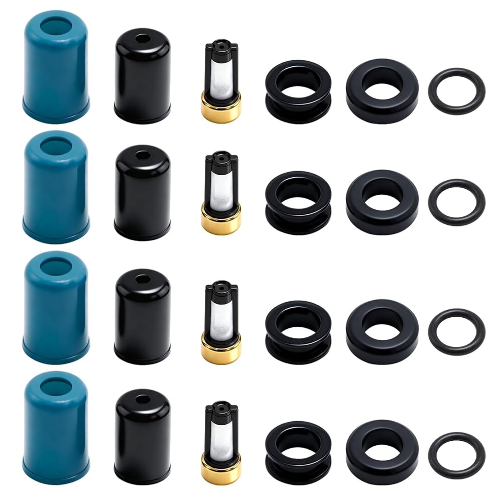 Essential Components: The kit includes 4 micro filters, 4 upper injector Viton O-rings, 4 upper injector grommets, and various pintle caps, providing everything needed for a complete injector rebuild.