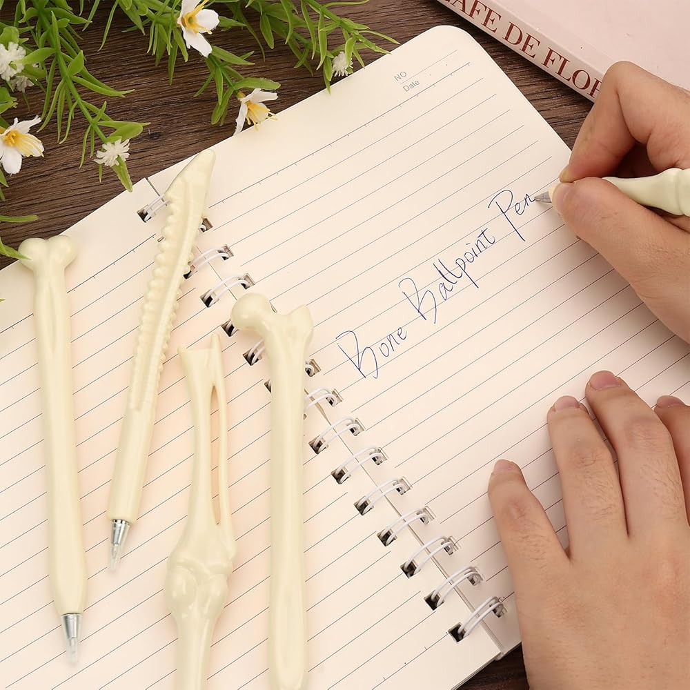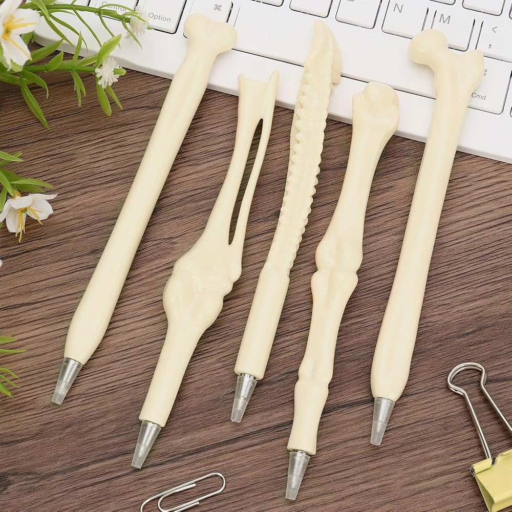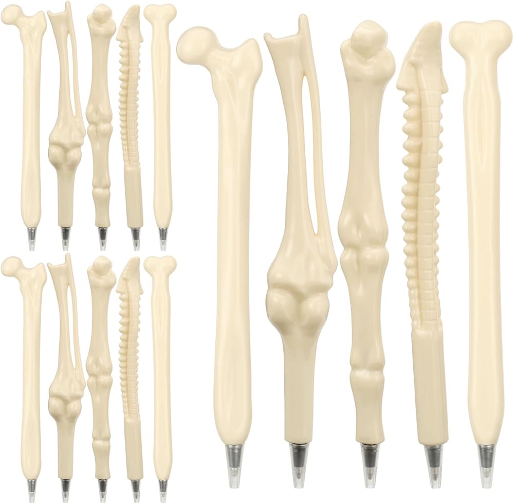 These 15 pcs bone pens, including 5 different styles, with 3 of each style. The writing is smooth and the quantity is sufficient, meeting your needs for daily use and sharing. These beige bone-shaped ballpoint pens are 5.8 inches long, have a 0.5mm fine point and with blue color ink. They are made of sturdy and durable plastic. The surface is smooth, the color is uniform, it is not prone to breaking or fading, it can write smoothly without running out of ink, and it is comfortable to hold, providing you with long-term usage value. The skeleton ballpoint pen is designed in the shape of a bone, with a unique appearance. It comes in 5 different bone styles, presenting a rich visual effect and providing you with a pleasant writing experience. The bone blue ink ballpoint pen can be given as a gift to medical staff, family members, friends, colleagues, relatives, etc. It is suitable for use in schools, offices, households, birthdays, Halloween, Christmas, etc. It can be used for studying, signing, writing, drawing and graffiti,etc