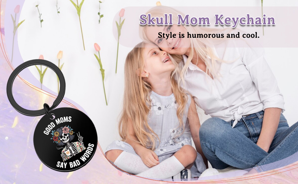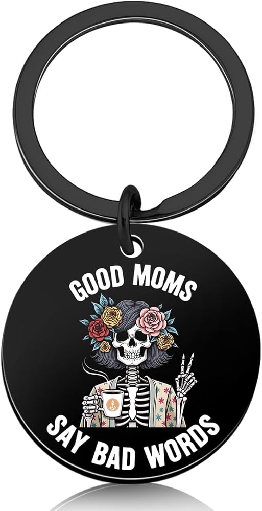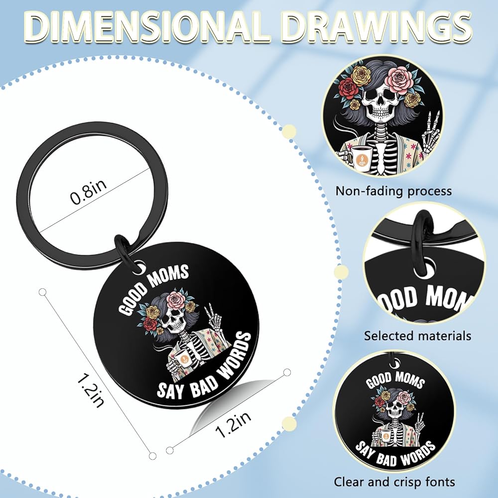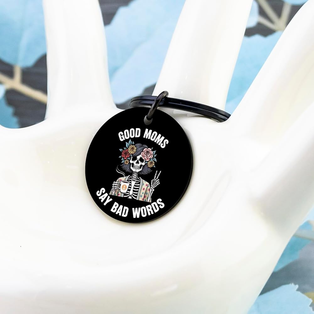 Mama Keychain/Best Mom Ever Gifts: The Funny Mom Keychain features an eye-catching "Good Moms Say Bad Words" engraving along with a stylish skull graphic of a woman holding a coffee, making it a standout accessory for any mom who has a sense of humor.This mom keychain is the cool gift for boy mom, girl mom from daughter, son.
