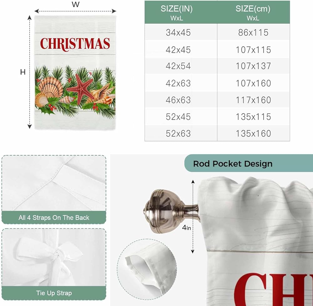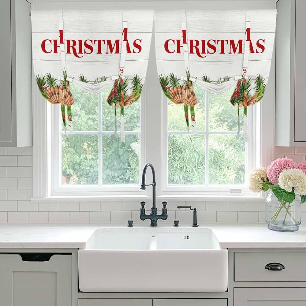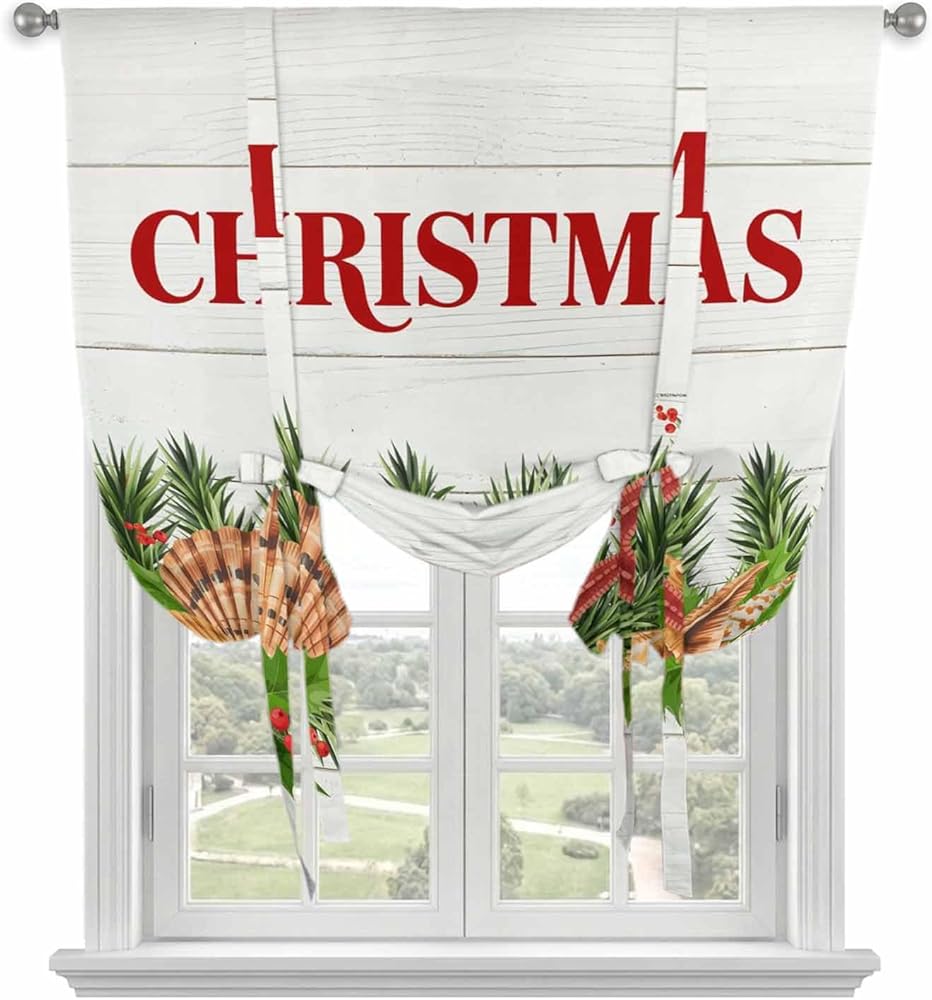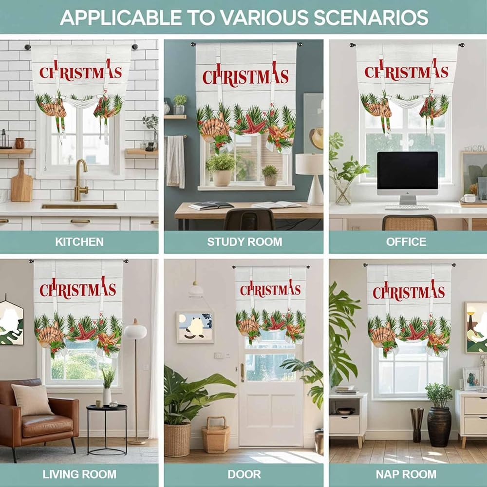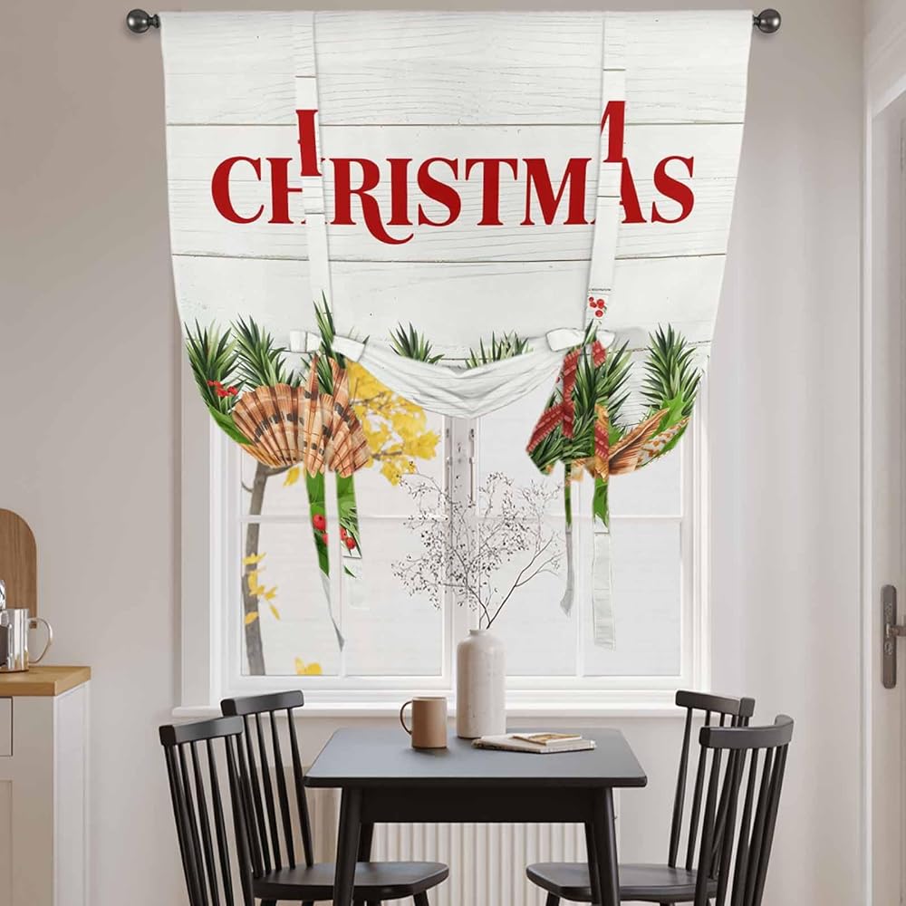 Coastal Christmas Tie Up Curtains for Window, Nautical Starfish Pine Needle Xmas Thermal Insulated Balloon Shade Adjustable Rod Pocket Curtains Valance Panels for Kitchen Bathroom Café 52'' x 63''
