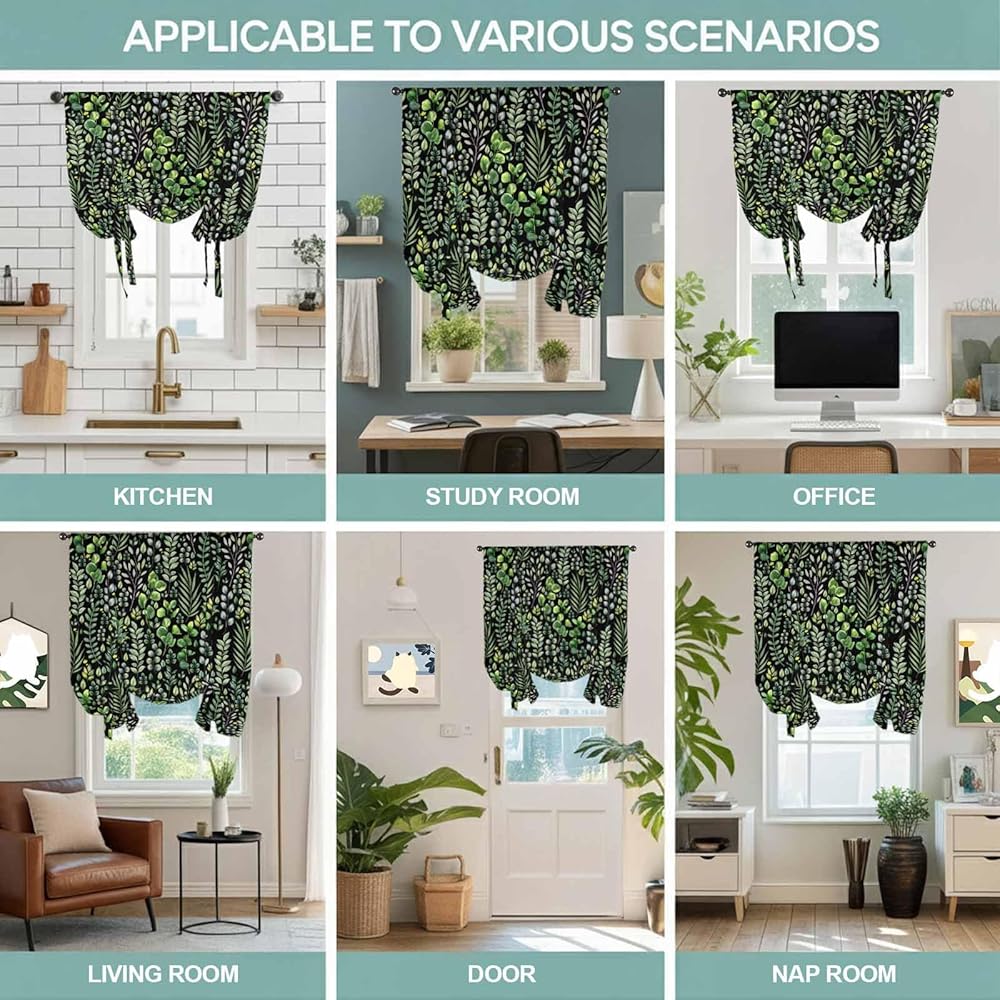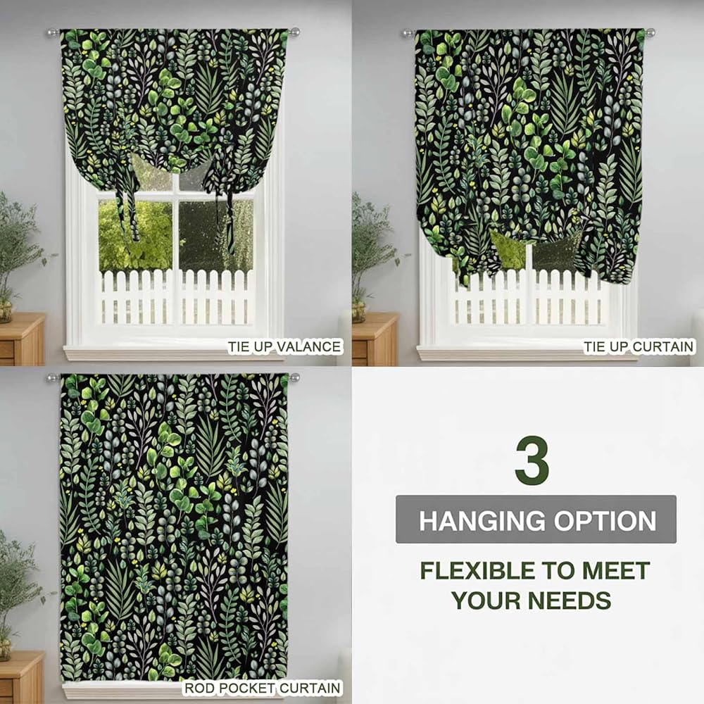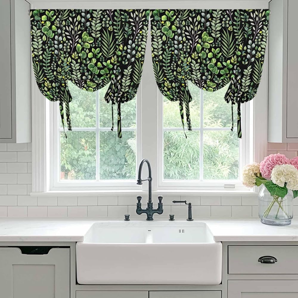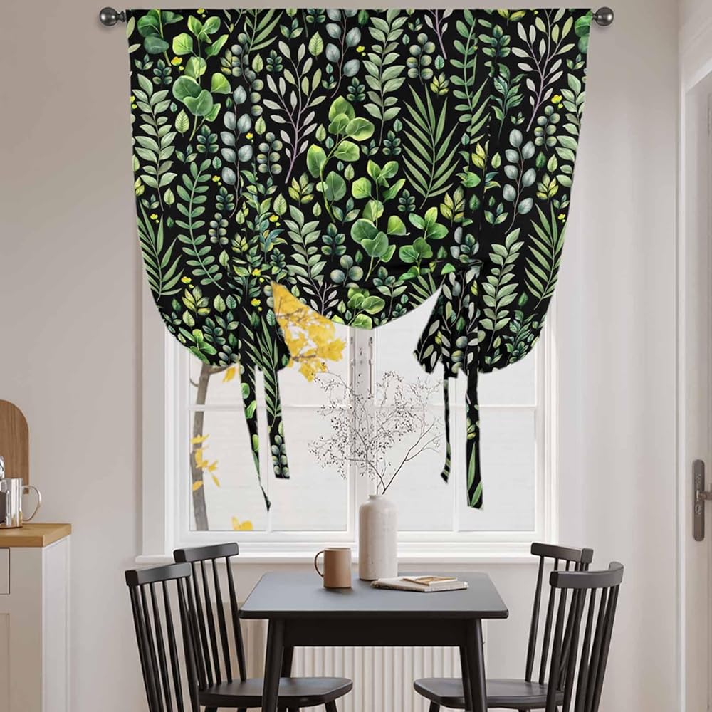 Green Leaves Tie Up Curtains for Window, Elegant Pastoral Summer Botanical Watercolor Thermal Balloon Shade Adjustable Rod Pocket Curtains Valance Panels for Kitchen Bathroom Café 34'' x 45''