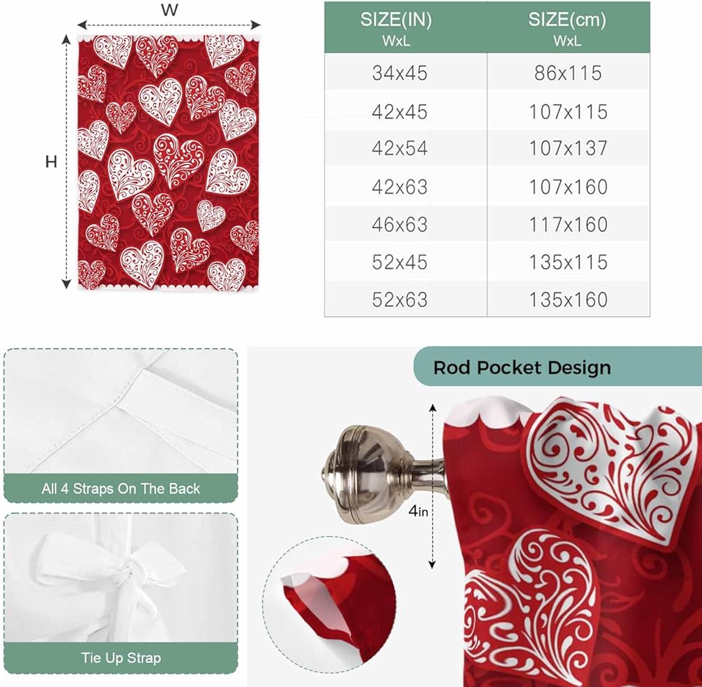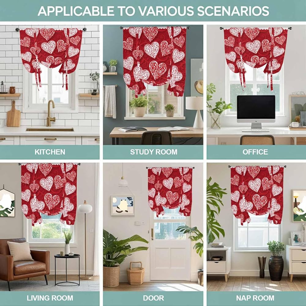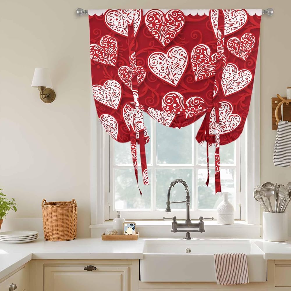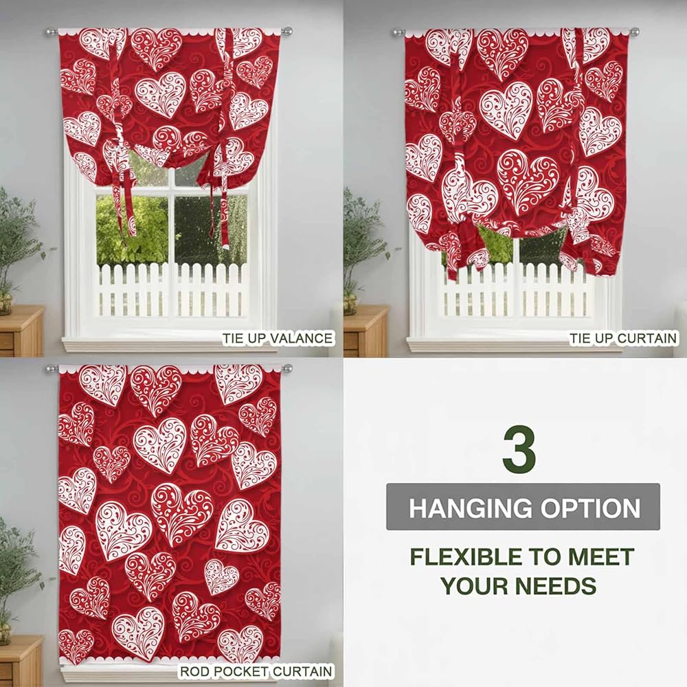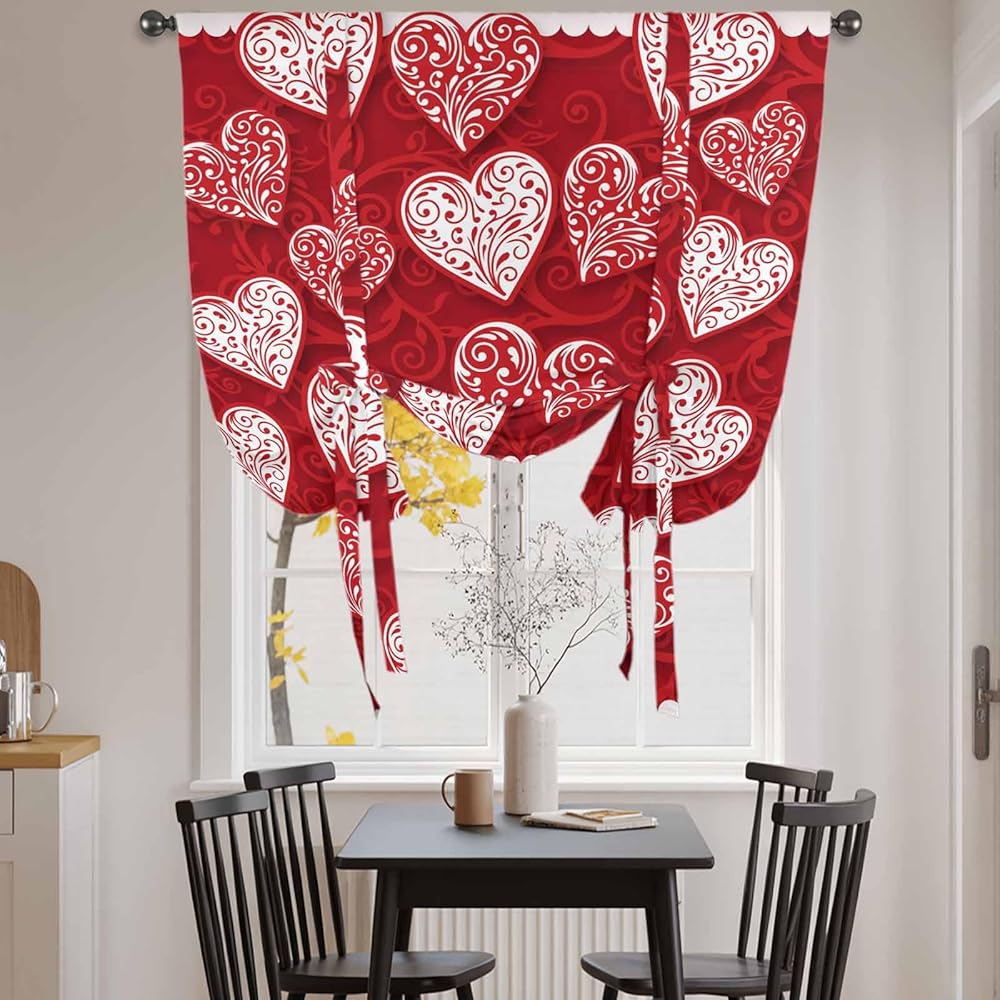 Valentine's Day Tie Up Curtains for Window, Red Love Heart Romantic Art Thermal Insulated Balloon Shade Adjustable Rod Pocket Curtains Valance Panels for Kitchen Bathroom Café 46'' x 63''