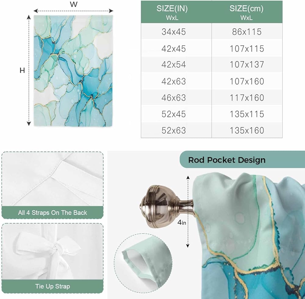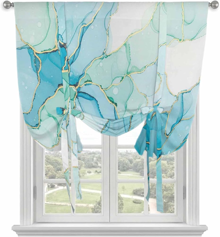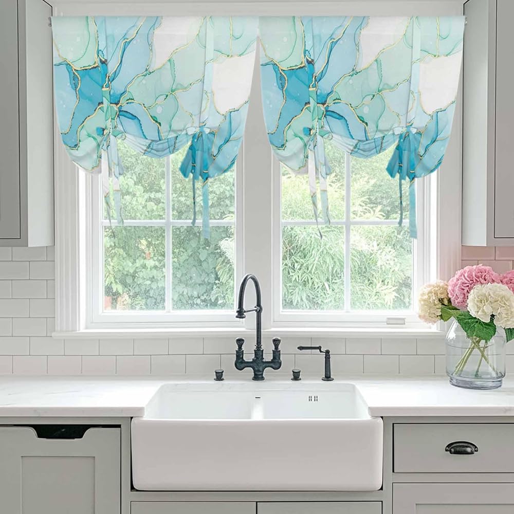 Turquoise Blue Marble Tie Up Curtains for Window, Modern Abstract Art Cracks Thermal Insulated Balloon Shade Adjustable Rod Pocket Curtains Valance Panels for Kitchen Bathroom Café 52'' x 45''